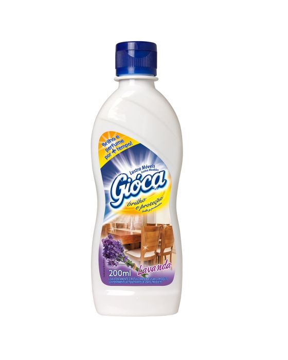 Carateristicas:O Lustra Móveis Gióca é formulado à base de cera natural e silicone, diminui a aderência da poeira e manchas de umidade, deixando sobre os móveis uma camada protetora fina e brilhante com uma suave e deliciosa fragrância no ar. Não é gorduroso e também pode ser usado para polir geladeiras, fogões esmaltados, azulejos, etc.- Fragrânia: Lavanda- Quantidade: 200ml * As especificações podem ser alteradas sem aviso prévio ** Imagem meramente ilustrativa
