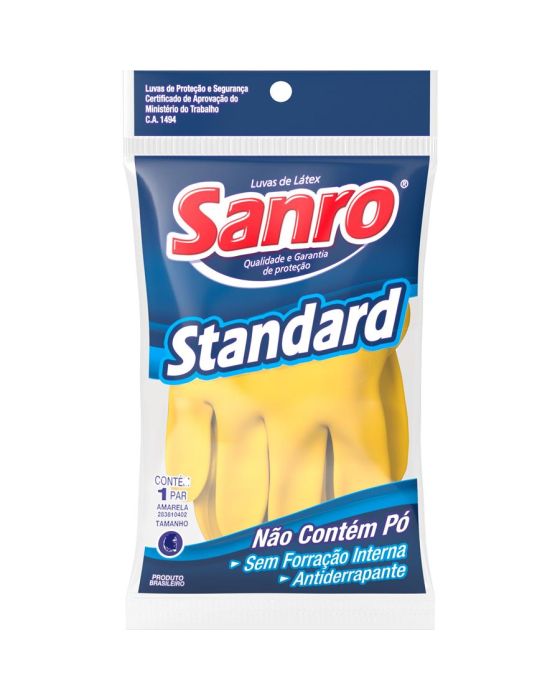 Caracteristicas:- As luvas Sanro Standard não são forradas com flocos de algodão e também não possuem pó. - Por isso, são indicadas para pessoas que tem alergia ao talco da luva (pó) e também para ambientes onde necessitam da ausência dos flocos de algodão. - Por esses motivos, elas são muito utilizadas nas indústrias farmacêuticas e de alimentos, mas também como uso diário em limpeza doméstica, faxina e jardinagem.- Outro benefício das luvas Sanro Standard é de ser “dupla face”, permitindo ao usuário escolher qual face usar de acordo com sua necessidade. - Possuem superfície antiderrapante e são indicadas para trabalhos que exigem maior precisão e sensibilidade tátil.- Possuem certificado de aprovação do Ministério do Trabalho e Emprego – C.A. do MTE – número 1.494.- Comprimento médio 300mm- Acabamento interno liso- Textura na palma e nos dedos- Embalagens: Acondicionadas em sacos plásticos, contendo um par cada.* As especificações podem ser alteradas sem aviso prévio ** Imagem meramente ilustrativa