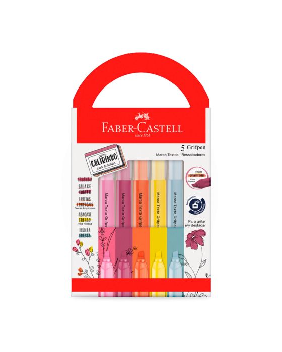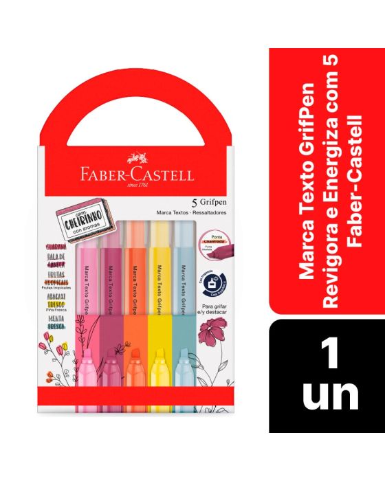 Características:Nova coleção de Grifpen, agora com cheirinho!O estojo Revigora e Energiza conta com 5 marca textos, cada uma com um aroma exclusivo que une a criatividade com uma experiência sensorial única!Detalhes:- Marca: Faber-Castell;- Modelo: GrifPen Revigora e Energiza;- Referência: MT/ES5REZF;- Linha: Canetas marca texto;- Cores: Verde (Menta Fresca), Amarelo (Abacaxi Fresco), Laranja (Frutas Tropicais), Roxo (Bala de Canela), Rosa (Guaraná);- Formato: Triangular;- Contém: 1 blister com 5 unidades com cores mistas;- Ponta: chanfrada média: para traços finos de 1.0mm e grossos de 4.0mm;- Tinta base água: não mancha o outro lado da folha- Possui fragrância duradoura;- Produto atóxico.Indústria Brasileira | Validade: Indeterminada.Armazenamento:- Evitar temperaturas acima de 45°C e exposição direta aos raios solares;- Armazenar em local seco e ventilado;- Tampar após o uso.Composição:- Tinta: Veículo Aquoso, umectantes, corantes, aditivos e aroma;- Tampa e corpo: Resinas termoplásticas;- Ponta: Metal e resina termoplásticas;- Pavio: Fibra.Medidas:- Dimensões da embalagem: 18,3 x 10,4 x 1,7cm (CxLxA);- Peso: 0,180kg.ATENÇÃO! NÃO RECOMENDÁVEL PARA CRIANÇAS MENORES DE 3 (TRÊS) ANOS POR CONTER PARTE(S) PEQUENA(S) QUE PODE(M) SER ENGOLIDA(S) OU ASPIRADA(S) E PONTA(S) AGUDA(S) FUNCIONAL(IS). CRIANÇAS ENTRE 5 (CINCO) E 8 (OITO) ANOS SOMENTE DEVEM UTILIZAR SOBR SUPERVISÃO DE UM ADULTO.* Registro Inmetro: 009475/2024.* As especificações podem ser alteradas sem aviso prévio ** Imagem meramente ilustrativa.