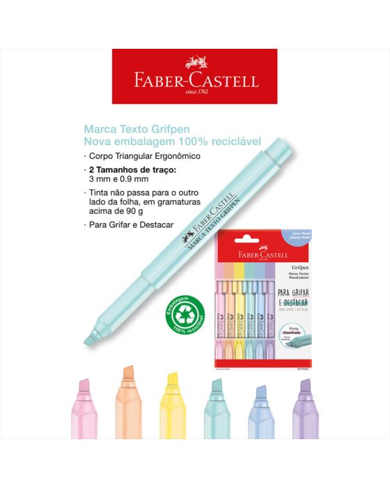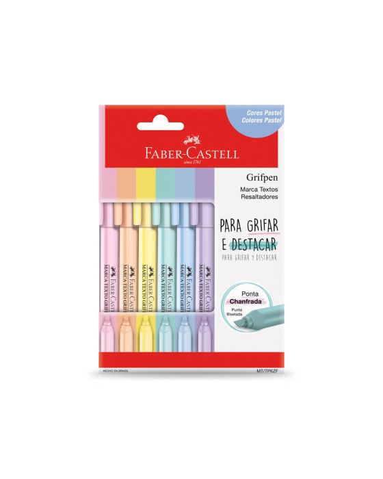 Caracteristicas:Com as canetas marca texto grifpen Faber-Castell suas anotações nunca mais serão as mesmas, são diversas cores de marcadores para destacar, grifar e deixar suas anotações super coloridas trazendo estilo para sua hora dos estudos!Detalhes:- Marca: Faber-Castell.- Modelo: MTTP6ZF- Linha: Marca Texto Grifpen.- Formato: Triangular ergônomico.- Cor: Cores mistas pastéis (Amarelo, Rosa, Laranja, Roxo, Azul e Verde).- Cor do corpo: Cores mistas pastéis na mesma cor da tinta.- Contém: Embalagem com 6 Unidades.- Ponta chanfrada- Tinta à base de água com secagem rápida- Não Mancham O Verso Da Folha De Papel- Ideal Para Quem Tem Uma Rotina De EstudoATENÇÃO! Não recomendável para crianças de até 3 (três) anos, por conter parte(s) pequena(s) que pode(m) ser engolida(s) ou aspirada(s).* As especificações podem ser alteradas sem aviso prévio ** Imagem meramente ilustrativa