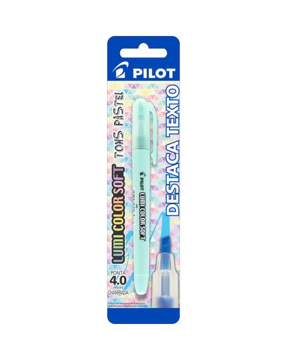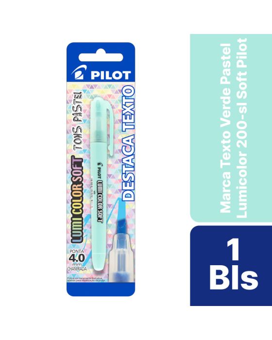 Características:Lançado no Brasil em 1975, o Lumi Color é uma das linhas mais tradicional da PILOT. Nesta versão, desenvolvida com tinta de composição especial em lindos tons pastel, destaca-se pela suavidade e baixa saturação nas cores.Equipado com uma resistente ponta chanfrada de poliéster, o Lumi Color Soft possibilita a prática de lettering e caligrafias sem danificar a ponta. Além disso, oferece marcação em traço duplo, com opção fina para sublinhar e grossa para destacar, proporcionando total aderência em superfícies de papel.Detalhes:- Marca: Pilot;- Modelo: Lumicolor 200-sl Soft;- Referência: 1482005;- Linha: Marca Texto;- Cor: Verde Pastel;- Ponta: Poliéster chanfrada 4,0mm;- Espessura de escrita: 3.8mm;- Contém: 1 Blister com uma unidade do produto;- Tinta de composicao especial pastel;- Não recarregavel.Armazenagem:- Armazenar em locais ventilados, frescos, secos e cobertos;- Mantenha a embalagem do produto fechada longe de fontes de calor, ignição, crianças e alimentos.Composição:- Tintas à base de água, aditivos, corantes, resinas termoplásticas e ponta de poliéster (mistura).Medidas:- Diâmetro médio do corpo: 1,27cm;- Diâmetro médio da tampa: 1,75cm;- Comprimento total: 13,67cm;- Comprimento sem tampa: 14,49mm.* As especificações podem ser alteradas sem aviso prévio ** Imagem meramente ilustrativa.