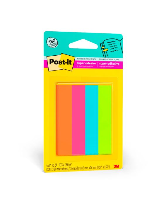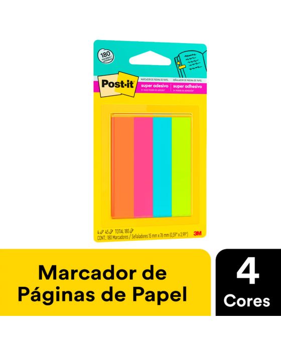 Características:O Marcador de Página Adesivo Post-it® Flags de Papel é ideal para marcar páginas de um livro ou datas na agenda, além de permitir escrita. Possui 2x mais aderência quando comparado ao adesivo tradicional Post-it® 3M.Detalhes:- Marca: Post-it®;- Fabricante: 3M;- Modelo: Adesivo Post-it® Flags de Papel;- Referência: HB004420657;- Linha: Marcadores de página;- Cor: Laranja, Pink, Azul e Verde;- Quantidade de folhas: 180 folhas (45 em cada bloco);- Quantidade de blocos: 4 blocos;- Contém: 1 embalagem com 180 folhas;- Medidas: 76 x 15mm (7,6 x 1,5cm);- Facilitam a busca por informações, otimizando o seu tempo através da organização;- Reposicionáveis, podendo ser retirado sem danificar a página;- Fácil para marcar os pontos mais importantes da sua agenda, podendo dividir cadernos e fichários, pois aceita escrita;- Descubra rapidamente o que é importante.Aplicações sugeridas:- Ideais para destacar compromissos importantes, demarcar livros, encontrar artigos em revistas e organizar documentos e projetos, sem a necessidade de riscar ou marcar o papel.Composição:- Fabricado em papel com adesivo com base vegetal reposicionável.Conteúdo da embalagem: 1 Marcador De Pagina Adesivo Post-it Flags De Papel 76 X 15 Mm 180 Folhas 3m.* As especificações podem ser alteradas sem aviso prévio ** Imagem meramente ilustrativa.
