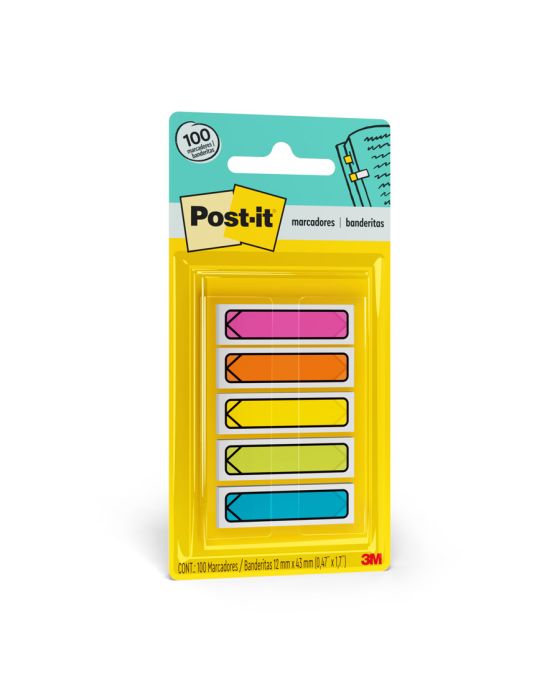 Características:Em um formato menor e diferenciado, os Marcadores Adesivos de Páginas Post-it® Formato de Seta chamam a sua atenção para não se esquecer de compromissos e assuntos importantes. Possuem suporte com sistema puxa fácil, o que facilita o uso.Detalhes:- Marca: Post-it®;- Fabricante: 3M;- Modelo: Adesivo Post-it® Flags;- Referência: HB004352215;- Linha: Marcadores de página;- Tipo: Setas;- Cor: Pink Neon, Laranja Neon, Amarelo Neon, Verde Neon e Azul Neon;- Quantidade de folhas: 100 folhas (20 em cada bloco);- Quantidade de blocos: 5 blocos;- Contém: 1 embalagem com 100 folhas;- Medidas: 11,9 x 43,2mm (1,19 x 4,32cm);- Facilitam a busca por informações, otimizando o seu tempo através da organização;- Reposicionáveis, podendo ser retirado sem danificar a página;- Fácil para marcar os pontos mais importantes da sua agenda, podendo dividir cadernos e fichários, pois aceita escrita;- Descubra rapidamente o que é importante;- Aceita Escrita.Aplicações sugeridas:- Ideais para destacar compromissos importantes, demarcar livros, encontrar artigos em revistas e organizar documentos e projetos, sem a necessidade de riscar ou marcar o papel.Composição:- Fabricado em papel com adesivo com base vegetal reposicionável.Conteúdo da embalagem: 1 Marcador De Pagina Adesivo Post-it Flags Setas Neon 11,9 X 43,2 Mm 100 Folhas 3m.* As especificações podem ser alteradas sem aviso prévio ** Imagem meramente ilustrativa.