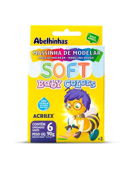 Caracteristicas: Ideal para atividades de desenvolvimento da coordenação motora e percepção de formas, também é ótima para quem gosta de usar sua criatividade artesanal!Foi desenvolvida para uso escolar ou entretenimento.Detalhes:- Marca: Acrilex.- Modelo: Baby Colors.- Referência: 07370.- Linha: Massa para modelar.- Volume/Peso: 90g.- Cores: Amarelo Bebê, Lilás Bebê, Verde Bebê, Azul Bebê, Salmão Bebê e Rosa Bebê.- Contém: 1 embalagem com 6 unidades.- À base de amido.- Super macia.- Com aroma de tutti-frutti.- Cores vivas e brilhantes.- Não tóxica.- Super macia.Esculturas:- Com a Massinha de Modelar Soft Acrilex, você pode guardar as esculturas que você quiser, é só deixar a massa secar durante 5 dias. -Após seca, pode ser pintada com Guache Acrilex. * As especificações podem ser alteradas sem aviso prévio ** Imagem meramente ilustrativa