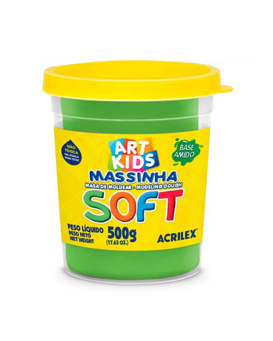 Características:Foi desenvolvida para uso escolar ou entretenimento. Ideal para atividades de desenvolvimento da coordenação motora e percepção de formas. Também é ótima para quem gosta de usar sua criatividade em trabalhos artesanais.Detalhes: - Marca: Acrilex.- Modelo: Massinha Soft.- Referência: 101.- Linha: Massa de modelar.- Cor: Verde.- Aroma: Tutti-Frutti.- Contém: 1 unidade do produto.- Peso: 500g.- Não Tóxica.- À base de amido.- Super macia.- Cores vivas e brilhantes.Uso: - Desenvolvida para uso escolar ou entretenimento.Ideal para: - Ideal para atividades de desenvolvimento da coordenação motora e percepção de formas, também é ótima para quem gosta de usar sua criatividade artesanal.Outros:- Você pode guardar as esculturas que você quiser, é só deixar a massa secar durante 5 dias. Após seca, pode ser pintada com Guache Acrilex.Composição:- Água, Carboidratos de Cereais, Glúten, Cloreto de Sódio, Conservante, Aroma, Aditivos e Pigmentos.* As especificações podem ser alteradas sem aviso prévio ** Imagem meramente ilustrativa.