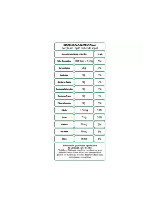 Características:- Não contém quantidade significativa de Gorduras trans e sódio- Peso: 250g- Medidas pacote (AxLxC): 13 x 6 x 4,5 cm- 100% natural- Ingredientes: caldo de cana de açucar- Alérgico: não contem Gluten- Produto sujeito a alteração de cor conforme safra da cana de açucar- Industria Brasileira* As especificações podem ser alteradas sem aviso prévio ** Imagem meramente ilustrativa.