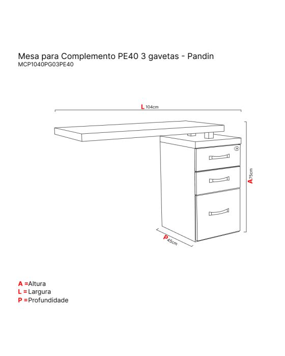 Características:Linha PE40 Pandin é uma linha com design clássico e sofisticado, que une beleza, funcionalidade e estilo com o melhor custo benefício do mercado!Detalhes:- Marca: Pandin.- Modelo: MCP1040PG03-PE40.- Linha: Mesa para escritório.- Cor: Walnut/Preto.- Gavetas: 3 gavetas.- Puxador: Tipo concha em poliestireno.- Medidas do puxador: 5,8cm.Gavetas:- Fechadura cilíndrica Tipo Yale - com sistema articulado contendo 2 chaves.- Deslizamento por trilho corrediça com roldanas em nylon.- 3 Gavetas corpo confeccionado em Galvalume (Al+Zn) chapa #26(0,45mm) frentes das gavetas em MDP BP 15mm- Gavetas superiores com frentes medindo: 14,5 x 34,1 1,5cm (AxLxE)- Gavetas superiores corpo medindo: 6,2 x 28 x 39,3cm (AxLxP)– Gaveta inferior Grande com frentes medindo: 29,2 x 34,1 x 1,5cm (AxLxE)- Gaveta inferio Grande corpo medindo: 6,2 x 28 x 39,3cm (AxLxP) com deslizamento por com suporte para armazenagem de pastas suspensas, desliza por trilho corrediça D3531 de 400mm com esferas de aço.Medidas:- Largura: 104cm.- Altura: 75cm.- Profundidade: 45cm.Acabamento:- Acabamento em fita em PVC (Poliestireno) com 1mm espessura com bordas aparentes encabeçadas.- Processo com rigoroso controle de qualidade analisado por um laboratório certificado pelo INMETRO atendendo as normas da NBR 8094:1983 Material metálico revestido e não revestido a corrosão por exposição a Nevoa Salina, onde é feito ensaio de corrosão acelerada com névoa salina por 500hrs, devendo o grau de corrosão determinado conforme a ISO 4628-3, não devendo ser maior que Ri 1,conforme item 4.3.1 da norma ABNT 13961:2010.- Pintura eletrostática controlada por Reciprocador, tornando à aplicação uniforme.Estrutura:- Tampo da mesa: Tampos encabeçados de 40mm composto na parte superior em MDP BP (15mm).- Pés da mesa: Confeccionado em MDP BP (25mm), com 2 espaçadores injetados em poliestireno, ponteira tipo Octogonal com espessura de (5mm)de poliestireno que permite aregulagem quando há desnível do piso.- Laterais do pé Gaveteiro: Confeccionado em MDP BP (15mm)- Retaguarda do pé gaveteiro: Confeccionado em Duraplac (3mm) medindo (ExAxL) 1,5 x 58,4 x 35 cm- Fundo pé gaveteiro : Confeccionado em MDP BP (15mm)*Produto Vendido DesmontadoManual em vídeo para montagem: https://www.youtube.com/watch?v=o2eEr-Nn0e8Obs: Mesa Complemento para anexar junto aos SKU´s 67175 (Vendida separadamente)*As especificações podem ser alteradas sem aviso prévio ** Imagem meramente ilustrativa.