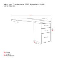 Características:Linha PE40 Pandin é uma linha com design clássico e sofisticado, que une beleza, funcionalidade e estilo com o melhor custo benefício do mercado!Detalhes:- Marca: Pandin.- Modelo: MCP1040PG03-PE40.- Linha: Mesa para escritório.- Cor: Walnut/Preto.- Gavetas: 3 gavetas.- Puxador: Tipo concha em poliestireno.- Medidas do puxador: 5,8cm.Gavetas:- Fechadura cilíndrica Tipo Yale - com sistema articulado contendo 2 chaves.- Deslizamento por trilho corrediça com roldanas em nylon.- 3 Gavetas corpo confeccionado em Galvalume (Al+Zn) chapa #26(0,45mm) frentes das gavetas em MDP BP 15mm- Gavetas superiores com frentes medindo: 14,5 x 34,1 1,5cm (AxLxE)- Gavetas superiores corpo medindo: 6,2 x 28 x 39,3cm (AxLxP)– Gaveta inferior Grande com frentes medindo: 29,2 x 34,1 x 1,5cm (AxLxE)- Gaveta inferio Grande corpo medindo: 6,2 x 28 x 39,3cm (AxLxP) com deslizamento por com suporte para armazenagem de pastas suspensas, desliza por trilho corrediça D3531 de 400mm com esferas de aço.Medidas:- Largura: 104cm.- Altura: 75cm.- Profundidade: 45cm.Acabamento:- Acabamento em fita em PVC (Poliestireno) com 1mm espessura com bordas aparentes encabeçadas.- Processo com rigoroso controle de qualidade analisado por um laboratório certificado pelo INMETRO atendendo as normas da NBR 8094:1983 Material metálico revestido e não revestido a corrosão por exposição a Nevoa Salina, onde é feito ensaio de corrosão acelerada com névoa salina por 500hrs, devendo o grau de corrosão determinado conforme a ISO 4628-3, não devendo ser maior que Ri 1,conforme item 4.3.1 da norma ABNT 13961:2010.- Pintura eletrostática controlada por Reciprocador, tornando à aplicação uniforme.Estrutura:- Tampo da mesa: Tampos encabeçados de 40mm composto na parte superior em MDP BP (15mm).- Pés da mesa: Confeccionado em MDP BP (25mm), com 2 espaçadores injetados em poliestireno, ponteira tipo Octogonal com espessura de (5mm)de poliestireno que permite aregulagem quando há desnível do piso.- Laterais do pé Gaveteiro: Confeccionado em MDP BP (15mm)- Retaguarda do pé gaveteiro: Confeccionado em Duraplac (3mm) medindo (ExAxL) 1,5 x 58,4 x 35 cm- Fundo pé gaveteiro : Confeccionado em MDP BP (15mm)*Produto Vendido DesmontadoManual em vídeo para montagem: https://www.youtube.com/watch?v=o2eEr-Nn0e8Obs: Mesa Complemento para anexar junto aos SKU´s 67175 (Vendida separadamente)*As especificações podem ser alteradas sem aviso prévio ** Imagem meramente ilustrativa.