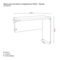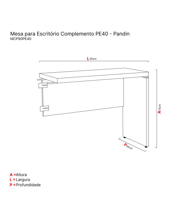 Características:Linha PE40 Pandin é uma linha com design clássico e sofisticado, que une beleza, funcionalidade e estilo com o melhor custo benefício do mercado!Detalhes:- Marca: Pandin.- Modelo: MCP90PE40.- Linha: Mesa para escritório.- Cor: Walnut/Preto.Medidas:- Largura: 90cm- Altura: 75cm- Profundidade: 45cmAcabamento:- Acabamento em fita em PVC (Poliestireno) com 1mm espessura com bordas aparentes encabeçadas.- Processo com rigoroso controle de qualidade analisado por um laboratório certificado pelo INMETRO atendendo as normas da NBR 8094:1983 Material metálico revestido e não revestido a corrosão por exposição a Nevoa Salina, onde é feito ensaio de corrosão acelerada com névoa salina por 500hrs, devendo o grau de corrosão determinado conforme a ISO 4628-3, não devendo ser maior que Ri 1,conforme item 4.3.1 da norma ABNT 13961:2010.- Pintura eletrostática controlada por Reciprocador, tornando à aplicação uniforme.Estrutura:- Tampo da mesa: Tampos encabeçados de 40mm composto na parte superior em MDP BP (15mm).- Retagaurda da Mesa: Confeccionado em MDP BP (15mm) e inferior por acabamentos moldurados de 70mm em MDP25mm.- Confeccionado em MDP BP (25mm), com 2 espaçadores injetados em poliestireno, ponteira tipo Octogonal com espessura de (5mm)de poliestireno que permite aregulagem quando há desnível do piso.*Produto Vendido DesmontadoManual em vídeo para montagem: https://www.youtube.com/watch?v=o2eEr-Nn0e8Obs: Mesa Complemento para anexar junto aos SKU´s 67172 (Vendida separadamente)*As especificações podem ser alteradas sem aviso prévio ** Imagem meramente ilustrativa.
