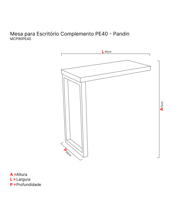 Características:Linha PE40 TUB Pandin é uma linha com design clássico e sofisticado, que une beleza, funcionalidade e estilo com o melhor custo benefício do mercado. Com pés tubolares em aço que dão um toque de modernidade e estilo ao ambiente!Detalhes:- Marca: Pandin.- Modelo: MCP90PE40TUB.- Linha: Mesa para escritório.- Cor: Walnut/Preto.Medidas:- Largura: 90cm- Altura: 75cm- Profundidade: 45cmAcabamento:- Acabamento em fita em PVC (Poliestireno) com 1mm espessura com bordas aparentes encabeçadas.- Processo com rigoroso controle de qualidade analisado por um laboratório certificado pelo INMETRO atendendo as normas da NBR 8094:1983 Material metálico revestido e não revestido a corrosão por exposição a Nevoa Salina, onde é feito ensaio de corrosão acelerada com névoa salina por 500hrs, devendo o grau de corrosão determinado conforme a ISO 4628-3, não devendo ser maior que Ri 1,conforme item 4.3.1 da norma ABNT 13961:2010.- Pintura eletrostática controlada por Reciprocador, tornando à aplicação uniforme.Estrutura:- Tampo da mesa: Tampos encabeçados de 40mm composto na parte superior em MDP BP (15mm).- Retagaurda da Mesa: Confeccionado em MDP BP (15mm).- Pés da mesa: Confeccionado em chapa de aço 18 (1,20mm), em formato tubular apoiado em 02 ponteiras reguláveis melhor nivelamento e maior estabilidade a mesa.- Medida do tubo dos pés da mesa: 01 pé tubular na medida 68 x 5 x 4,5cm (AxLxP) com passagem para fios.*Produto Vendido DesmontadoManual em vídeo para montagem: https://www.youtube.com/watch?v=o2eEr-Nn0e8Obs: Mesa Complemento para anexar junto aos SKU´s 67175 (Vendida separadamente)*As especificações podem ser alteradas sem aviso prévio ** Imagem meramente ilustrativa.