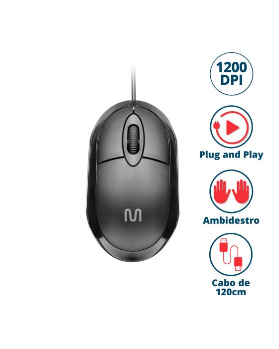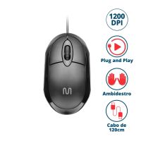 Caracteristicas:- Conexão USB- Óptico de 1200 dpi- Possui 3 botões- Compatível com Windows, Max os x 9.0 ou supeior- Cor: Preto- Comprimento do cabo: + ou - 1,20m (Junto com a conexão USB)- Peso: 50g- Dimensões: 9,3 x 5,4 x 3,3cm- Garantia: 3 Anos contra defeitos de fabricação- Conteúdo da Embalagem : 1 Mouse com fio * As especificações podem ser alteradas sem aviso prévio ** Imagem meramente ilustrativa.
