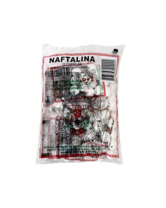 NAFTALINAA Naftalina, de fórmula molecular C10H8, é um repelente natural que já foi vastamente utilizado por donas de casa em armários e gavetas. Traças e baratas são repelidas pelo vapor que esta substância exala, sendo assim, as roupas guardadas próximas à naftalina ficam protegidas do ataque destas pragas.Caracteristicas:Apresentada em embalagens seladas, evitando assim o cheiro forte do produto, até que se abra o pacote para seu uso.Conteúdo: Embalada em sachet com 20g. - Naftalina em bolas com 20g. - Muito usado como anti-traça. - Marca: GalitosAlgumas dicas são úteis quanto ao uso da Naftalina: - Não retire as bolinhas de naftalina de dentro da embalagem que as comporta. Desta forma os vapores tóxicos ficam em parte retidos e apenas insetos serão afetados com a quantidade mínima exalada. - Não utilize o produto em roupas para crianças, pois elas são mais suscetíveis à intoxicação.* As especificações podem ser alteradas sem aviso prévio ** Imagem meramente ilustrativa.