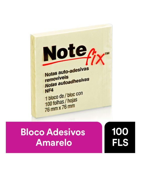 Características:Suas folhas são reposicionáveis, ou seja, possuem adesivo de qualidade 3M, que permite que sejam retirados e recolocados, sem danificar papéis ou outras superfícies, sem deixar resíduos do adesivo e sem perder a eficiência na fixação.Detalhes:- Marca: Notefix™;- Fabricante: 3M;- Modelo: Bloco Adesivo Notefix™;- Referência: HB004088694;- Linha: Blocos Adesivos;- Cor: Amarelo;- Quantidade de folhas: 100 folhas;- Quantidade de blocos: 1 bloco;- Contém: 1 unidade do produto com 1 bloco de 100 folhas;- Medidas: 76 x 76mm (7,6 x 7,6cm);- Folhas reposicionáveis;- Notas adesivas com qualidade 3M;- Permite deixar mensagens de forma prática e rápida.Aplicações sugeridas:- Ideal para fazer anotações e lembretes.Composição:- Papel tipo superbond com adesivo Acrílico sintético, removível e reposicionável.AVISO!- O adesivo pode deixar marcas em algumas superfícies ou remover tinta. Teste antes de usar!Conteúdo da embalagem: 1 Notefix 654 Amarelo 76x76mm 100 Folhas 3m.* As especificações podem ser alteradas sem aviso prévio ** Imagem meramente ilustrativa.