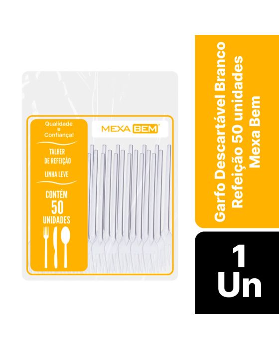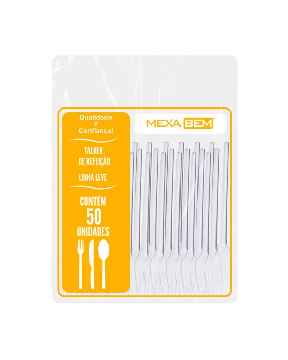 Características:O Garfo Linha Leve Mexa Bem é a opção ideal para o momento do almoço, fabricado em poliestireno cristal, é um produto ideal para escritórios, copas, salas de reunião, restaurantes, lanchonetes e padarias.Detalhes:- Marca: Mexa Bem;- Modelo: Linha Leve;- Linha: Talheres;- Tipo: Garfo para refeição;- Cor: Branco;- Tamanho: 15,5cm;- Quantidade: 50 unidades;- Contém: 1 unidade com 50 unidades;- Refeições práticas e leves;- Qualidade e Confiança;- Material atóxico;- Produto descartável;- Produto com 100% de matéria prima e pigmentos virgens..Indústria Brasileira | Validade Indeterminada.Ideal para:- Ideal para uso em escritórios, salas de reuniões, copa, restaurantes, lanchonetes, cafeterias e demais ambientes corporativos.Recomendações:- A princípio mantenha o produto em sua embalagem original, ao abrigo de luz e bem fechada após o uso;- Além disso não reutilize a embalagem vazia para outros fins;- Após o uso, descarte o garfo de maneira adequada em um recipiente de lixo.Composição:- Poliestireno cristal e pigmentos atóxicos.Medidas:- Dimensões do produto: 2 x 0,5 x 15,5cm (CxLxA);- Dimensões da embalagem: 23,5 x 15,5 x 3,5cm (CxLxA);- Peso: 89g.ATENÇÃO! CONSERVE FORA DO ALCANCE DAS CRIANÇAS E DOS ANIMAIS DOMÉSTICOS.* As especificações podem ser alteradas sem aviso prévio** Imagem meramente ilustrativa.