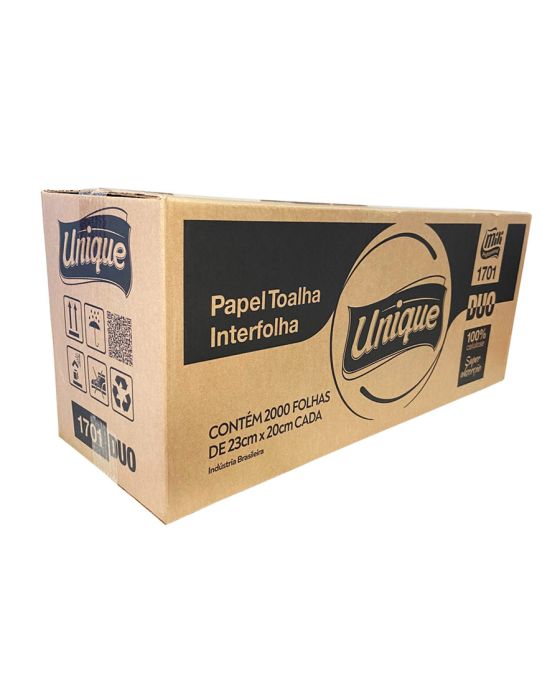 Características:O Papel Toalha Interfolhado Branco 23x20cm Soft Duo Mili Professional, é feito de 100% celulose e possui alta capacidade de absorção, ideal para ambientes com alta movimentação, como banheiros, vestiários, lavabos e demais lugares.Detalhes:- Marca: Unique- Modelo: Soft Duo;- Referência: 1701;- Linha: Papel Toalha;- Tipo: Interfolhado;- Cor: Branco;- Quantidade de folhas: 2.000 folhas;- Gramatura das folhas: 34g/m2;- Super Absorção;- 100% Celulose.Indústria Brasileira | Validade: Indeterminada.Composição:- 100% Fibras Celulósicas.Recomendações:- Produto não perecível;- Conservar em local seco.Medidas:- Dimensões do produto: 19,5 x 19,5cm;- Dimensões da embalagem: 49,4 x 21,6 x 25,7cm (CxLxA).* As especificações podem ser alteradas sem aviso prévio ** Imagem meramente ilustrativa.