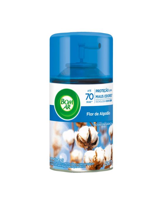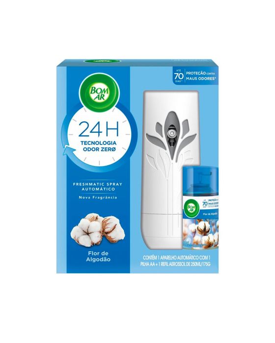 Características:Bom Ar® Freshmatic Spray Automático conta agora com novas fragrâncias exclusivas que possuem tecnologia odor zero, capazes de remover maus odores de animais domésticos, cozinha e banheiro. Além disso o produto dura até 70 dias.Detalhes:- Marca: Bom Ar- Modelo: Freshmatic Spray Automático- Fragrância: Flor de Algodão- Alimentação: 1 pilhas AA (já inclusas)- Conteúdo da empalagem: 1 aparelho, 1 pilhas AA e 1 lata de 250ml/175g.- Duração: Até 70 dias.- Design moderno e discreto combinando com qualquer ambienteRecomendado para:- Eliminar Maus Odores de Banheiro, cozinha ou maus odores causados por animais domésticos.Instruções de uso:- Abra a tampa superior do seu aparelho automático.- Verifique se o aparelho está desligado - A chave de controle deverá estar na posição desligado icone (!).- PARA INSERIR O REFIL:° Abra o aparelho segurando a metade inferior e gire a metade superiorem sentido anti-horário.º Insira o refil aerossol na metade inferior do dispositivo.º Para fechar, coloque a metade superior sobre a metade inferior e gire no sentido horário para travar até ouvir um clique, com o bico pulverizador posicionado na fente do aparelho.- A pilha deve ser colocada sob a tampa superior do dispositivo, inserindo 1 pilha alcalina AA no compartimento alinhando os terminais (+/-) corretamente.- Quando ligado, pulveriza por 15 minutos.- Defina o controle de intensidade da fragrância (baixo, médio e alto).- Esolcha o local apropriado com altura mínima de 2 metros do chão.- Trocar o aerossol quando não for mais emitida a fragrância.Utilize em ambientes com:- Em cômodos de no mínimo 15m2 e de no máximo 20m2 para uma aplicação eficazCONSERVE FORA DO ALCANCE DE CRIANÇAS E DOS ANIMAIS DOMÉSTICOSCUIDADO! INFLAMÁVEL, NÃO PERFURE O VASILHAME MESMO VAZIO.* As especificações podem ser alteradas sem aviso prévio ** Imagem meramente ilustrativa