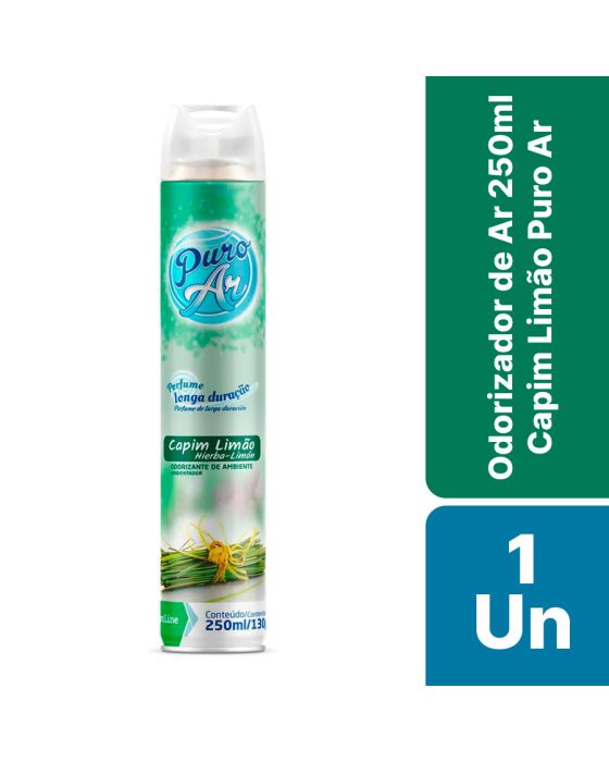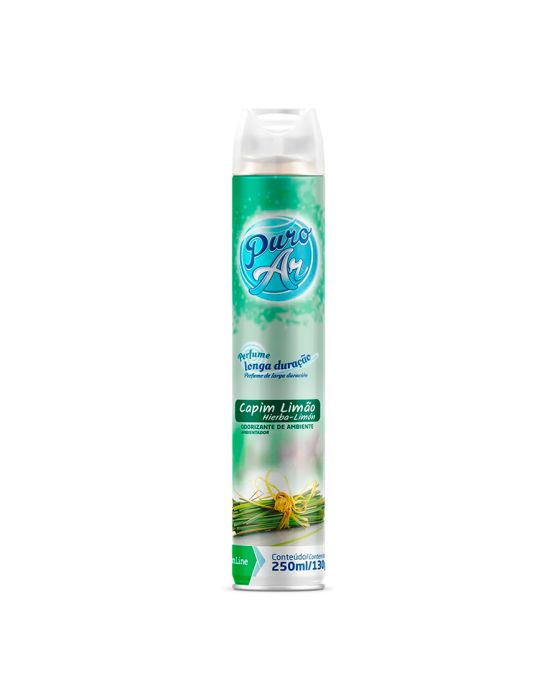 Características:Com ação calmante, o Odorizante de ambiente Capim Limão também dá sensação de refrescância. Por isso, este aroma tão popular não poderia faltar na seleção exclusiva de fragrâncias da Puro Ar. Ideal para ambientes que desejam oferecer sensação de frescor. Detalhes:- Marca: Puro Ar;- Linha: Odorizadores de Ar;- Tipo: Aerossol;- Fragrância: Capim Limão;- Volume/Peso: 250ml / 130g;- Contém: 1 unidade do produto;- Longa duração;- Fácil Aplicação;- Tamanho exclusivo;- Maravilhosa fragrância.Indústria Brasileira | Validade: 2 anos após a data de fabricação.Modo de usar:- Agite bem a embalagem antes de cada aplicação;- Pulverize sempre o jato para cima no ambiente, evitando dirigir sobre pessoas, plantas, animais, alimentos, paredes, tecidos, chamas ou superfícies aquecidas.Precauções:- Não ingerir;- Evite a inalação ou aspiração, contato com os olhos e contato com a pele;- Cuidado, inflamável! - Mantenha longe do fogo e de superfícies aquecidas;- Não perfurar a embalagem vazia;- Não jogue no fogo ou incinerador;- Não exponha à temperatura superior a 50ºC;- Mantenha o produto em sua embalagem original;- Não reutilizar a embalagem vazia. Composição: - Antioxidante, veículo, propelente, etanol e fragrância.ATENÇÃO! CONSERVE FORA DO ALCANCE DAS CRIANÇAS E DOS ANIMAIS DOMÉSTICOS.* As especificações podem ser alteradas sem aviso prévio ** Imagem meramente ilustrativa.