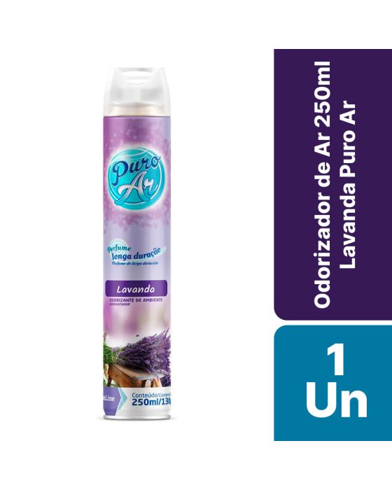 Características:Fragrância floral e calmante, o Odorizante de Ambiente Puro Ar Lavanda é a escolha certa para deixar qualquer lugar com sensação de limpeza e frescor. Ideal também para ambientes que buscam oferecer conforto e tranquilidade. Detalhes:- Marca: Puro Ar;- Linha: Odorizadores de Ar;- Tipo: Aerossol;- Fragrância: Lavanda;- Volume/Peso: 250ml / 130g;- Contém: 1 unidade do produto;- Longa duração;- Fácil Aplicação;- Tamanho exclusivo;- Maravilhosa fragrância.Indústria Brasileira | Validade: 2 anos após a data de fabricação.Modo de usar:- Agite bem a embalagem antes de cada aplicação;- Pulverize sempre o jato para cima no ambiente, evitando dirigir sobre pessoas, plantas, animais, alimentos, paredes, tecidos, chamas ou superfícies aquecidas.Precauções:- Não ingerir;- Evite a inalação ou aspiração, contato com os olhos e contato com a pele;- Cuidado, inflamável! - Mantenha longe do fogo e de superfícies aquecidas;- Não perfurar a embalagem vazia;- Não jogue no fogo ou incinerador;- Não exponha à temperatura superior a 50ºC;- Mantenha o produto em sua embalagem original;- Não reutilizar a embalagem vazia. Composição: - Antioxidante, veículo, propelente, etanol e fragrância.ATENÇÃO! CONSERVE FORA DO ALCANCE DAS CRIANÇAS E DOS ANIMAIS DOMÉSTICOS.* As especificações podem ser alteradas sem aviso prévio ** Imagem meramente ilustrativa.
