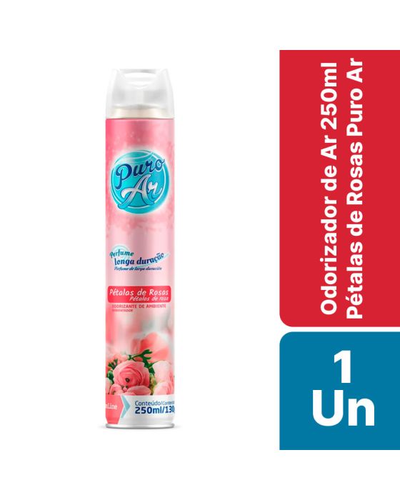 Características:Mais uma fragrância floral e delicada, o Pétalas de Rosa é um aroma da Puro Ar que oferece um cheiro suave mas marcante, deixando os ambientes agradáveis e com sensação de cuidado. Detalhes:- Marca: Puro Ar;- Linha: Odorizadores de Ar;- Tipo: Aerossol;- Fragrância: Pétalas de Rosas;- Volume/Peso: 250ml / 130g;- Contém: 1 unidade do produto;- Longa duração;- Fácil Aplicação;- Tamanho exclusivo;- Maravilhosa fragrância.Indústria Brasileira | Validade: 2 anos após a data de fabricação.Modo de usar:- Agite bem a embalagem antes de cada aplicação;- Pulverize sempre o jato para cima no ambiente, evitando dirigir sobre pessoas, plantas, animais, alimentos, paredes, tecidos, chamas ou superfícies aquecidas.Precauções:- Não ingerir;- Evite a inalação ou aspiração, contato com os olhos e contato com a pele;- Cuidado, inflamável! - Mantenha longe do fogo e de superfícies aquecidas;- Não perfurar a embalagem vazia;- Não jogue no fogo ou incinerador;- Não exponha à temperatura superior a 50ºC;- Mantenha o produto em sua embalagem original;- Não reutilizar a embalagem vazia. Composição: - Antioxidante, veículo, propelente, etanol e fragrância.ATENÇÃO! CONSERVE FORA DO ALCANCE DAS CRIANÇAS E DOS ANIMAIS DOMÉSTICOS.* As especificações podem ser alteradas sem aviso prévio ** Imagem meramente ilustrativa.