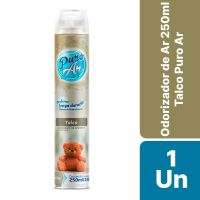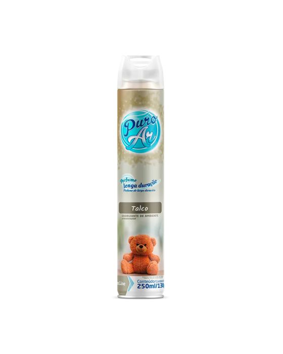 Características:Versatilidade para este é um dos “cheirinhos” de associação afetiva! O Odorizante de Ambiente Talco oferece fragrância suave. Uma opção para ambientes que desejam oferecer aconchego. Detalhes:- Marca: Puro Ar;- Linha: Odorizadores de Ar;- Tipo: Aerossol;- Fragrância: Talco;- Volume/Peso: 250ml / 130g;- Contém: 1 unidade do produto;- Longa duração;- Fácil Aplicação;- Tamanho exclusivo;- Maravilhosa fragrância.Indústria Brasileira | Validade: 2 anos após a data de fabricação.Modo de usar:- Agite bem a embalagem antes de cada aplicação;- Pulverize sempre o jato para cima no ambiente, evitando dirigir sobre pessoas, plantas, animais, alimentos, paredes, tecidos, chamas ou superfícies aquecidas.Precauções:- Não ingerir;- Evite a inalação ou aspiração, contato com os olhos e contato com a pele;- Cuidado, inflamável! - Mantenha longe do fogo e de superfícies aquecidas;- Não perfurar a embalagem vazia;- Não jogue no fogo ou incinerador;- Não exponha à temperatura superior a 50ºC;- Mantenha o produto em sua embalagem original;- Não reutilizar a embalagem vazia. Composição: - Antioxidante, veículo, propelente, etanol e fragrância.ATENÇÃO! CONSERVE FORA DO ALCANCE DAS CRIANÇAS E DOS ANIMAIS DOMÉSTICOS.* As especificações podem ser alteradas sem aviso prévio ** Imagem meramente ilustrativa.