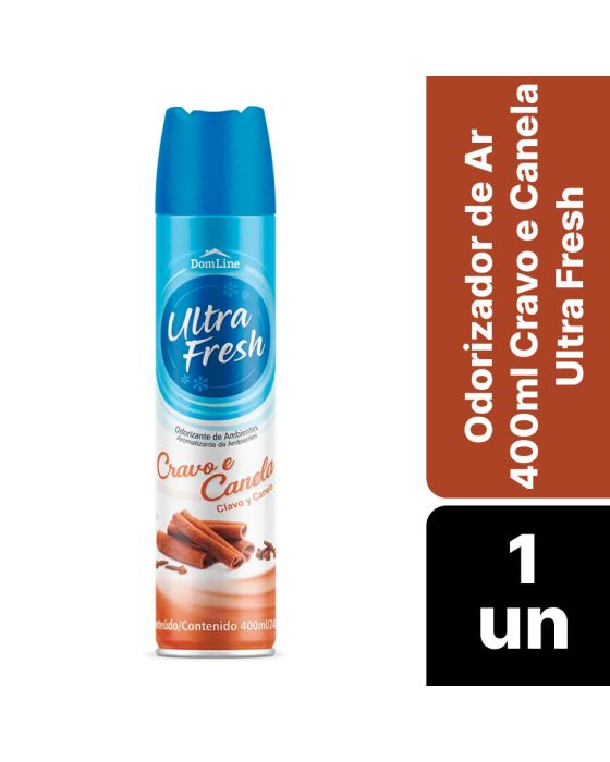 Caracteristicas:O Ultra Fresh Cravo e Canela foi desenvolvido e formulado com exclusivas fragrâncias para refrescar o seu ambiente, deixando os locais suavemente perfumados. É recomendado o uso em locais como banheiros, quartos, salas e escritórios.Detalhes:- Marca: Ultra Fresh.- Fabricante: Dom Line.- Modelo: Odorizador de ambientes.- Linha: Aerossol.- Fragrância: Cravo e Canela- Quantidade: 400ml.- Peso: 240g.- Contém: 1 unidade do produto.Modo de usar:- Agite bem a embalagem antes e durante o uso.- Pulverize sempre o jato para cima no ambiente, evitando dirigir sobre pessoas, plantas, animais, alimentos, paredes, tecidos, chamas ou superfícies aquecida.Conservação:- Não expor a temperatura superior a 50°C.- Mantenha longe do fogo e de superfícies aquecidas.- Mantenha o recipiente hemeticamente fechado em lugar ventilado.- Manter o produto em sua embalagem original. Não reutilizar embalagens vazias.- Mantenha ao abrigo de luz solar. - Não deixar a embalagem em veículos, risco de explosão ou vazamentos.Composição:- Antioxidante, veículo, propelente, etanol e fragrância.O fabricante não se rsponsabiliza pelo uso incorreto do produto!* As especificações podem ser alteradas sem aviso prévio ** Imagem meramente ilustrativa *** CONSERVE FORA DO ALCANCE DAS CRIANÇAS E DOS ANIMAIS DOMÉSTICOS.
