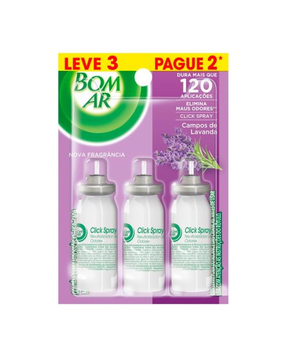 Caracteristicas:O Bom Ar Click Spray é um discreto aparelho plástico com miniaerossol que se fixa facilmente nas superfícies. Com apenas um click você obtém perfumação duradoura de maneira simples e rápida. Graças a sua fórmula, Bom Ar Click Spray libera um suave perfume, que deixa os ambientes com um agradável frescor.Detalhes:- Marca: Bom Air- Modelo: Refil Click Spray- Contém: 3 unidades promocionais de refil com 12ml cada.- Fragrância: Campos de Lavanda- Embalagem promocional leve 3 pague 2- Dura mais que 120 aplicaçõesOnde usar:- BanheiroModo de usar:- Levante a tampa plástica do seu aparelho BomAr Click Spray, retire o tubo vazio. - Insira o tubo até ouvir o clique do encaixe. Feche a Tampa- Vaporize: para perfumar, aperte no local indicado. Um clique é suficiente para uma perfumação duradoura. - Lave as mãos após a utilização do produto.- Para retirar o aparelho não puxe, gire-o.- Composição:- Fragrância e PropelentesConservação:- Mantenha hrmeticamente fechado em um lugar ventilado.- Não expor ao sol.- Armazenarem local seco e arejado.- Não expor a umidade ou água.- NÃO ARMAZENAR EM BANHEIROS, EMBAIXO DE PIAS, TANQUES.CONSERVE FORA DO ALCANCE DE CRIANÇAS E DOS ANIMAIS DOMÉSTICOS!!* As especificações podem ser alteradas sem aviso prévio ** Imagem meramente ilustrativa.