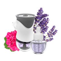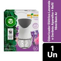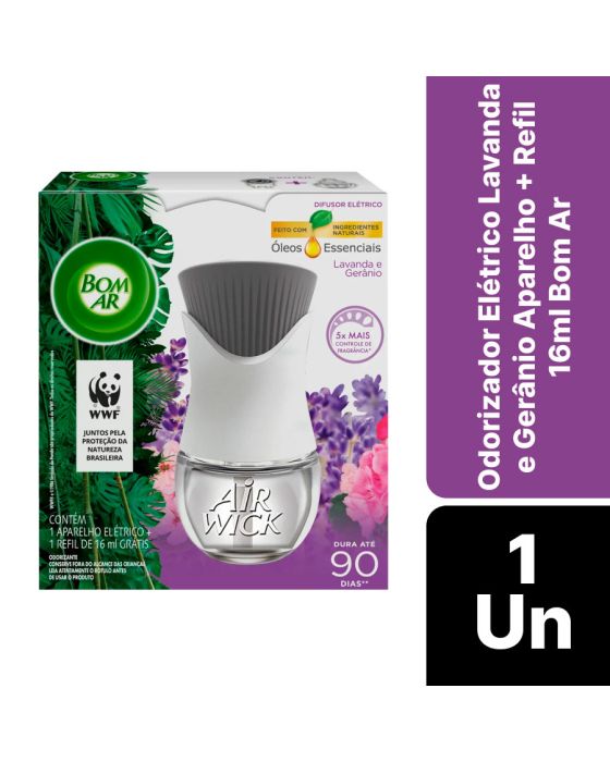 Características:Bom Ar® Difusor Elétrico é um aromatizador de ambiente prático e moderno que é feito com óleos essenciais e perfuma continuamente qualquer ambiente, trazendo maior aconchego para sua casa.Detalhes:- Marca: Bom Ar;- Linha: Difusores Elétricos;- Fragrância: Lavanda e Gerânio;- Contém: 1 aparelho elétrico + 1 refil de 16ml grátis;- Dura até 90 dias (se usado na intensidade mínima);- Com ingredientes naturais e proporcionam sensação de bem estar;- Enquanto estiver na tomada, o Bom Ar® Difusor Elétrico promove perfumação contínua;- Possui 5 níveis de intensidade.Modo de uso:- Remova a tampa do frasco que contém o liquido;- Mantenha o frasco na posição vertical e insira no aparelho até ouvir um click;- Introduza na tomada. Se sua tomada estiver na vertical, gire o plug do aparelho no sentido anti-horário para que ele fique posicionado na vertical;- De acordo com a necessidade, ajuste a intensidade da fragrância - 5 níveis ( Posição mínima duração de 90 dias (12h/dia);- Para retirar o frasco, retire o aparelho da tomada e o puxe-o ligeiramente para baixo.Precauções:- Conserve fora do alcance das crianças e dos animais domésticos;- Cuidado: Irritante para os olhos e pele.Use somente com refis Bom Ar.* As especificações podem ser alteradas sem aviso prévio ** Imagem meramente ilustrativa.