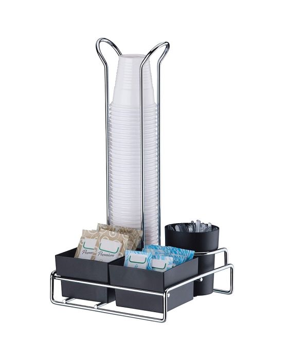 Características:O suporte para copos e saches é prático e funcional, ideal para ser deixado na bancada do café, proporciona organização e setorização no ambiente. Possui local para armazenar copos e recipientes para acomodar, sachês e mexedor.Fabricado em aço cromado e revestido por uma camada extra de um protetivo especial, Rust Free, que resulta em uma resistência maior contra ferrugem. - Peso: 0.306 kg - Dimensões: 15 x 14,5 x A27,5cm - 3 Divisórias plásticas - Aplicação: Complementos de copa/cozinha (Bares, Hotéis, Restaurantes) - Cor/Acabamento: - Cromado - Copo Plástico p/ palhetas: PretoO momento de servir é especial e deve-se ter cuidados para que seja proveitoso e prático. Com alguns utensílios, podemos facilitar este momento e torná-lo único.Tenha praticidade no seu dia a dia com produtos funcionais.* Imagem meramente ilustrativa** Acessórios nao acompanham o produto