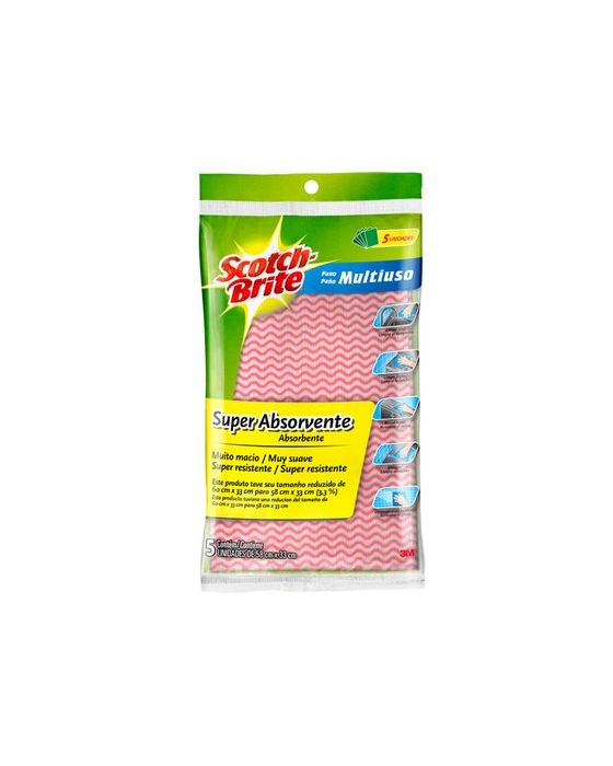 Características:O produto que você confia há anos. O Pano Multiuso Scotch-Brite é o famoso pano de furinhos, utilizado para limpeza de toda a casa. É super absorvente e seca rapidamente, realizando limpezas mais rápidas e fáceis.Leve e prático, ele absorve bem os líquidos com fácil enxágue, sem reter odores. O Pano Multiuso Scotch-Brite é flexível e macio, e não mancha ou desbota as superfícies. É super absorvente e seca rapidamente, realizando limpezas mais rápidas e fáceis. Este pano vai fazer com que você abandone o papel toalha e panos de algodão velhos. Cada cozinha deve ter um Pano Multiuso Scotch-Brite!Detalhes:- Marca: Scotch-Brite®;- Fabricante: 3M™;- Modelo: Pano Multiuso Scotch-Brite™;- Referência: HB004470181;- Linha: Pano Multiuso;- Cor: Rosa;- Quantidade: 5 panos multiuso;- Contém: 1 embalagem com 5 unidades;- É lavável à máquina- Mais durável do que papel toalha- É super absorvente e seca rapidamente, realizando limpezas mais rápidas e fáceis- Leve e prático, ele absorve bem os líquidos com fácil enxágue, sem reter odores- Indicado para limpeza de toda a casa em suas diversas aplicaçõesValidade: 2 anos.Aplicação:- É indicado para limpeza de toda a casa em suas diversas aplicações, como limpeza, polimento e remoção de poeira em cozinhas e banheiros.Medidas:- Dimensões: 58 x 33cm (AxL).* As especificações podem ser alteradas sem aviso prévio ** Imagem meramente ilustrativa.