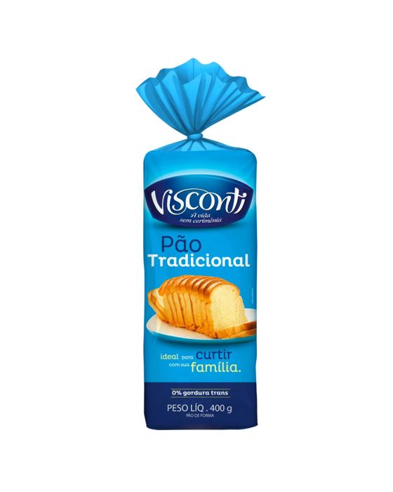 Caracteristicas:Pão Tradicional 400g ViscontiLista de ingredientesFARINHA DE TRIGO ENRIQUECIDA COM FERRO E ÁCIDO FÓLICO, AÇÚCAR, GORDURA VEGETAL, SAL E CONSERVADOR: PROPIONATO DE CÁLCIO.Alérgicos: Contém glúten, derivados de trigo e de soja.Pode conter: centeio, cevada, aveia, amendoim, amêndoa, avelãs, castanha-de-caju, castanha-do-pará, pistaches, gergelim, leite, nozes e ovos.Informações nutricionaisA tabela nutricional e lista de ingredientes presentes no site referem-se a porção de referência de 50g.Os valores das tabelas nutricionais e lista de ingredientes podem variar de acordo com as gramaturas dos pacotes de cada produto.Valor energético: 139kcal - 7%Carboidratos: 26g - 9%Proteínas: 4,4g - 6%Gorduras Totais: 1,9g - 4%Gorduras Saturadas: 0,7g - 3%Gorduras Trans: 0g - 0%Fibra alimentar: 1,5g - 6%Sódio: 174mg - 7% - % Valores diários de referência com base em uma dieta de 2.000 kcal ou 8.400 kJ. Seus valores diários podem ser maiores ou menores dependendo de suas necessidades energéticas. - Valor diário não estabelecido.* As especificações podem ser alteradas sem aviso prévio ** Imagem meramente ilustrativa.