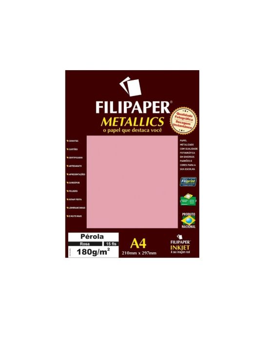 Caracteristicas:Papel metalizado fabricado em dois padrões e cinco cores para a sua escolha, com qualidade fotográfica, exclusivo revestimento de pigmentos metalizados e formulação inkjet receptiva- Cor: Pérola Rosa- Fabricante: Filiperson- Tamanho: A4 (210mm x 297mm) na gramatura 180g/m² - Embalagem: 15 folhasPapel metalizado com qualidade fotográfica, ideal para convites, cartões, imagens, artesanatos e muito mais* As especificações podem ser alteradas sem aviso prévio ** Imagem meramente ilustrativa