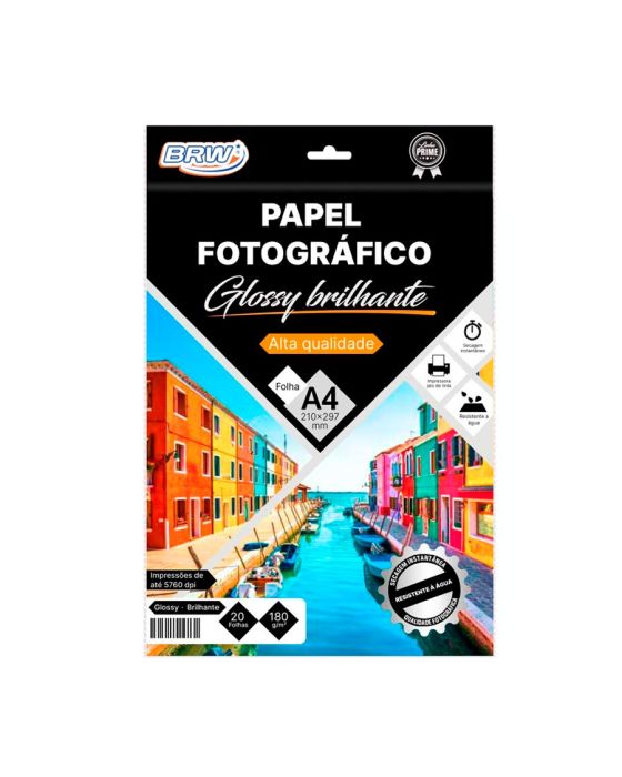 Caracteristicas:O Papel Fotográfico Glossy Brilhante 180g/m² BRW é um material indispensável para impressões de produtos gráficos, tais como convites, lembrancinhas, cartões, imãs, entre outros. Com excelente qualidade fotográfica e compatibilidade com impressoras à jato de tinta, têm grande utilidade em empresas, comércios e até mesmo para uso pessoal!O modelo Glossy possui um brilho intenso para um resultado atraente e chamativo. Além disso, proporciona impressões de até 5760 dpi e excelente absorção de tinta, não transpassando o verso do papel.Fácil de usar, o papel fotográfico BRW também conta com secagem instantânea, resistência à água e adaptabilidade para impressoras de alta resolução.Detalhes:- Marca: BRW.- Modelo: PP2018.- Linha: Papel fotográfico.- Cor: Branco.- Acabamento: Brilhante.- Contém: 1 embalagem com 20 folhas.- Formato: A4.- Gramatura: 180 g/m².- Resolução: Até 5.760 dpi.- Impressão Jato de tinta.- Secagem rápida.- Alta qualidade e maior durabilidade da imagem.- Excelente fixação.- A resistente à água.Ideal para: - convites, lembrancinhas, cartões, imãs, entre outros.Uso: - Exclusivo em impressoras jato de tinta (Inkjet).* As especificações podem ser alteradas sem aviso prévio ** Imagem meramente ilustrativa.