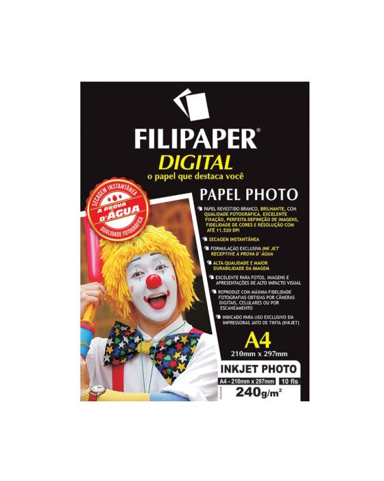 Características:O papel que destaca você!Detalhes:- Marca: Filipaper.- Modelo: FP02578- Linha: Papel fotográfico.- Cor: Branco.- Acabamento: Brilhante.- Contém: 1 embalagem com 10 folhas.- Formato: A4.- Gramatura: 240 g/m².- Resolução: Até 11.520 dpi.- Impressão Jato de tinta.- Secagem instantânea.- Alta qualidade e maior durabilidade da imagem.- Excelente fixação.- A prova d'água.Ideal para: - Ideal para reprodução de imagens e fotografias com a máxima fidelidade.Uso: - Exclusivo em impressoras jato de tinta (Inkjet).Resolução:- Máxima fidelidade fotografias tiradas por câmeras digitais, celulares ou por escaneamento.* As especificações podem ser alteradas sem aviso prévio ** Imagem meramente ilustrativa.