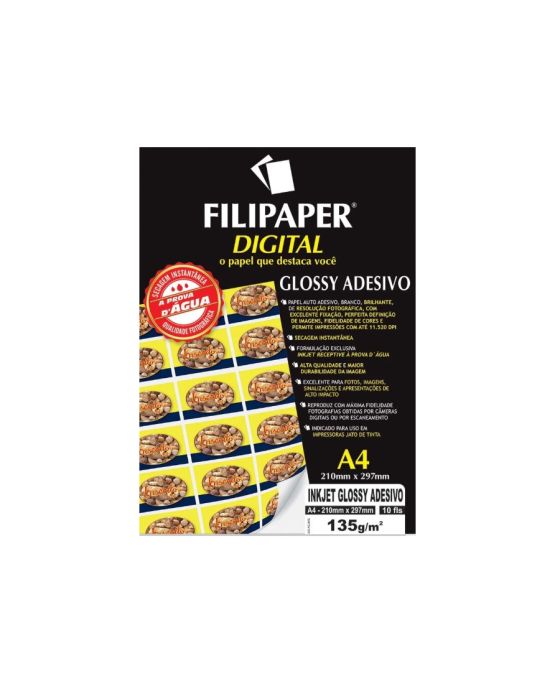 Caracteristicas:Papel Adesivo Branco, Brilhante, de Secagem Instantânea.Ideal para impressão de trabalhos com perfeita definição de cores e imagens com longa duração.Papel Glossy Fotográfico revestido branco, com perfeita definição de imagens, fidelidade de cores e alta resolução. Indicado para uso em impressoras Jato de Tinta.- Gramatura: 135 g/m²- Papel Adesivo- Formato: A4 (210x297mm)- Número de folhas: 10 folhas - Gramatura: 135 g/m²- Resolução: Alta resolução- Marca Filiperson/ Linha Filipaper- Papel à prova d'água - dando máxima fidelidade às fotografias obtidas por câmeras digitais ou escaneamento.* As especificações podem ser alteradas sem aviso prévio ** Imagem meramente ilustrativa