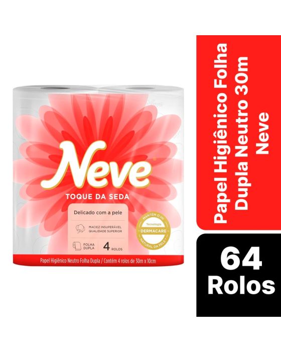 Características:Neve Toque da Seda, oferece uma maciez insuperável e qualidade superior em folhas duplas. O papel higiêncio que é delicado com a pele. Todos os papeis higiênicos Neve® contém a tecnologia Dermacare, que mantém o PH natural da pele.Detalhes:- Marca: Neve®;- Modelo: Toque de seda;- Linha: Papel Higiênico;- Cor da folha: Branco;- Tipo de folha: Neutro;- Folha: Folha dupla;- Quantidade de rolos por pacote: 4 rolos;- Quantidade de pacotes por fardo: 16 pacotes;- Contém: 1 fardo de papel higiênico com 16 pacotes com 4 rolos cada totalizando 64 rolos;- Metros por rolo: 20 metros;- Tecnologia Dermacare;- Mantém o pH;- Maciez insuperável;- Qualidade Superior;Prazo de validade indeterminado.Armazenamento:- Armazene em local seco.Medidas:- Dimensões do produto: 10cm x 20m.* As especificações podem ser alteradas sem aviso prévio ** Imagem meramente ilustrativa