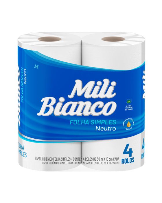 Características:Com o papel higiênico Mili Bianco Folha Simples, você cuida da sua família, seja ela do tamanho que for. Os rolos tem alta capacidade de absorção e resistência, além de passarem por testes que garantem a segurança e o cuidado de todos.Detalhes: - Marca: Mili.- Modelo: Bianco.- Linha: Papel Higiênico.- Cor: Branco.- Tipo: Neutro.- Contém: 1 embalagem com 4 unidades.- Folha: Simples.- Dermatologicamente testado.Medidas:- 30m x 10cm cada rolo.* As especificações podem ser alteradas sem aviso prévio ** Imagem meramente ilustrativa