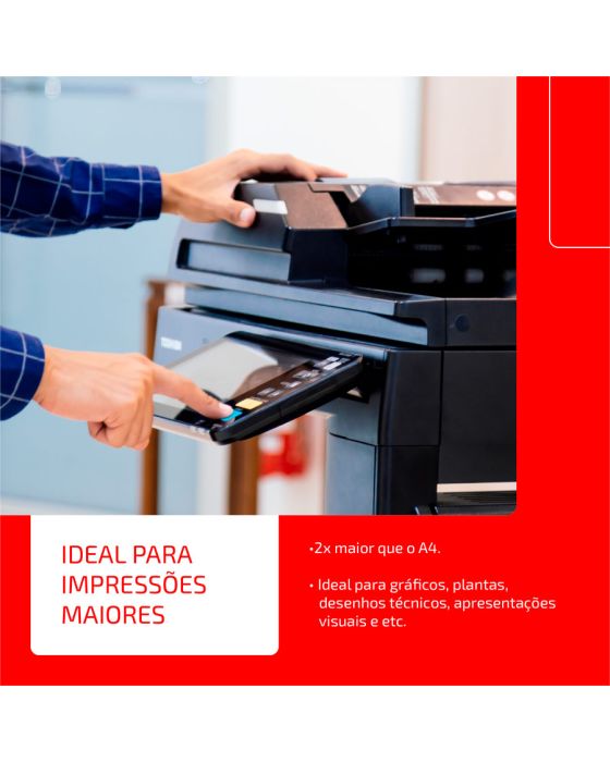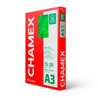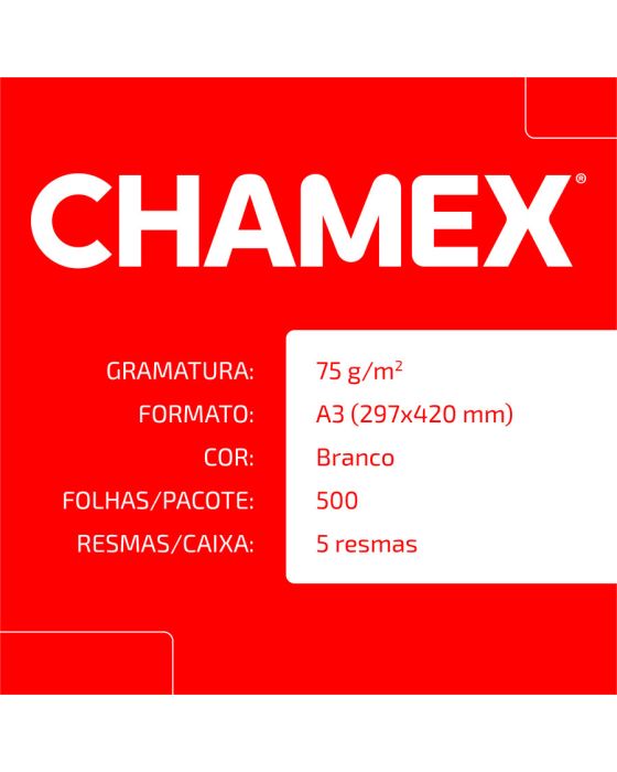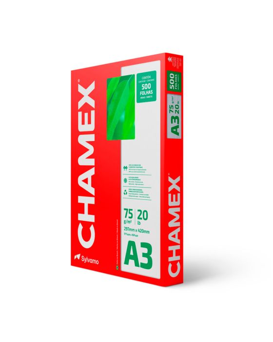Caracteristicas:- Chamex A3 75g garante ótima performance em todo tipo de atividade, como criar, escrever, imprimir e reproduzir.- Com superfície resistente, corte perfeito e equilibrada absorção, permite melhor deslizamento do papel na impressora e evita desperdício de tinta.- É produzido a partir do cultivo de eucalipto 100% renovável e as fibras são tratadas para obter o mais elevado grau de brancura.- Chamex A3 75 garante excelente performance em equipamentos e impressoras de alta velocidade. - O teste foi realizado em laboratórios da International Paper nos EUA. Nesse teste, são impressos, continuamente, 10.000 folhas de papel em impressoras de alto volume e é aceitável 1 atolamento a cada 10.000 cópias. - Os testes foram efetuados em equipamento multifuncional com velocidade de 180 páginas por minuto.99% de não atolamento- Para excelência nos resultados, é necessário que o papel seja armazenado em local adequado, isento de umidade e luminosidade excessiva, bem como isento de avarias que possam comprometer as características originais de fabricação do papel.- Importante: a qualidade do papel influencia no processo de impressão, porém os componentes dos equipamentos, assim como a manutenção e qualidade deles também são responsáveis.- A International Paper garante a qualidade do papel no processo de impressão.- Formato: A3 (297x420mm)- Gramatura: 75g/m2- Folhas/resma:500- Resma/caixa: 5- Certificação: Cerflor * As especificações podem ser alteradas sem aviso prévio ** Imagem meramente ilustrativa.