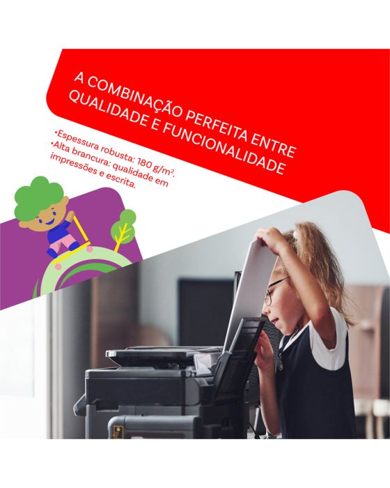 Caracteristicas:Papel multiuso, utilizado tanto para trabalhos escolares como no dia-a-dia. - Embalagem com 50fls. - Tamanho A4 210 x 297mm - Gramatura 180g/m² - Cor: BrancoFosco Ideal para impressão de: cartão de visita, convites, lembranças etc * As especificações podem ser alteradas sem aviso prévio ** Imagem meramente ilustrativa