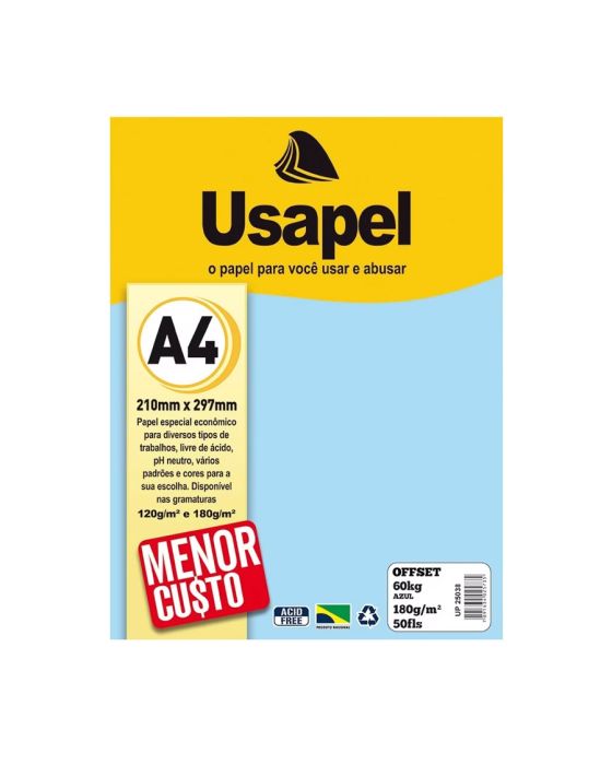 Características:É um papel multiuso, indicado para impressões em laser, jato de tinta e outros processos. Com composição alcalina, livre de ácidos (acid free), resistente a altas temperaturas, de secagem rápida e possibilita impressões frente e verso.Detalhes:- Marca: Usapel;- Modelo: Usapel Offset;- Referência: 25038;- Linha: Papel Sulfite Colorido;- Cor: Azul;- Quantidade de folhas: 50 folhas;- Contém: 1 embalagem com 50 folhas do produto;- Tamanho: A4;- Formato: 120 x 297mm (12 x 29,7cm);- Gramatura: 180 g/m2;- Resistente a altas temperaturas;- Secagem rápida;- Possibilidade de impressão frente e verso;- Produto não tóxico.Indicado para:- Papel azul para uso escolar, residencial e do escritório.Composição:- alcalina e livre de ácidos.Medidas:- Dimensões do produto: 120 x 297mm (12 x 29,7cm);- Gramatura: 180g/m2.* As especificações podem ser alteradas sem aviso prévio ** Imagem meramente ilustrativa.