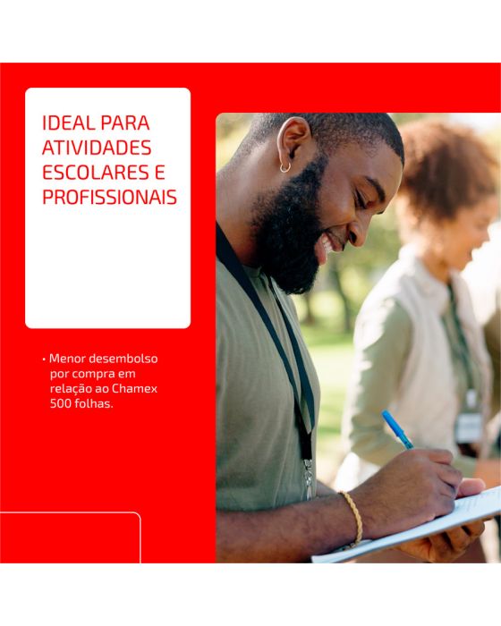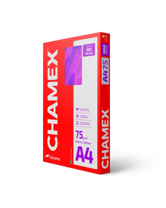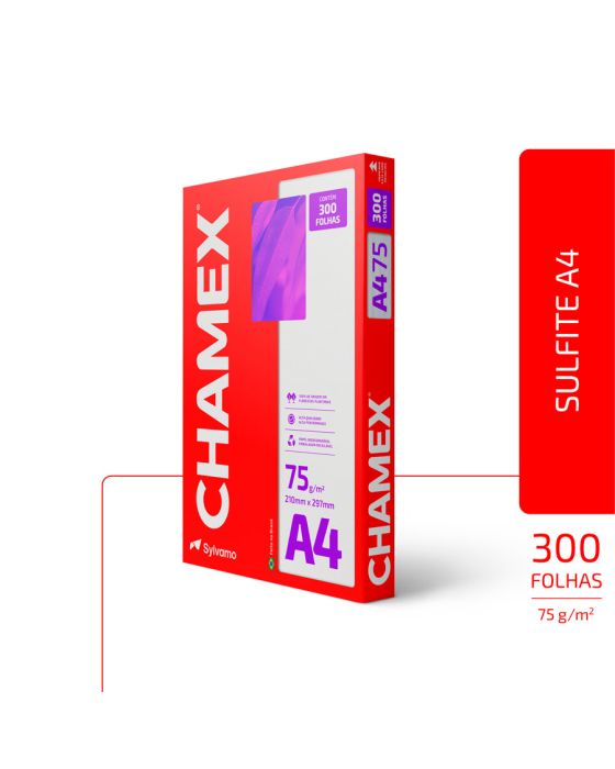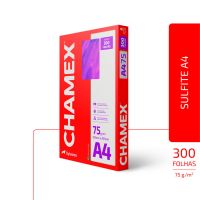Caracteristicas:O mesmo Chamex de sempre, agora também com 300 folhas.Chamex! Há 50 anos no Brasil- Chamex A4 75g garante ótima performance em todo tipo de atividade, como criar, escrever, imprimir e reproduzir.- Com superfície resistente, corte perfeito e equilibrada absorção, permite melhor deslizamento do papel na impressora e evita desperdício de tinta.- É produzido a partir do cultivo de eucalipto 100% renovável e as fibras são tratadas para obter o mais elevado grau de brancura.- Chamex A4 75 garante excelente performance em equipamentos e impressoras de alta velocidade. - O teste foi realizado em laboratórios da International Paper nos EUA. Nesse teste, são impressos, continuamente, 10.000 folhas de papel em impressoras de alto volume e é aceitável 1 atolamento a cada 10.000 cópias. - Os testes foram efetuados em equipamento multifuncional com velocidade de 180 páginas por minuto.99% de não atolamento- Para excelência nos resultados, é necessário que o papel seja armazenado em local adequado, isento de umidade e luminosidade excessiva, bem como isento de avarias que possam comprometer as características originais de fabricação do papel.- Importante: a qualidade do papel influencia no processo de impressão, porém os componentes dos equipamentos, assim como a manutenção e qualidade deles também são responsáveis.- A International Paper garante a qualidade do papel no processo de impressão.- Formato: A4 (210x297mm)- Gramatura: 75g/m2- Folhas por pacote: 300- Pacotes por caixa: 8- Certificação: Cerflor * As especificações podem ser alteradas sem aviso prévio ** Imagem meramente ilustrativa.