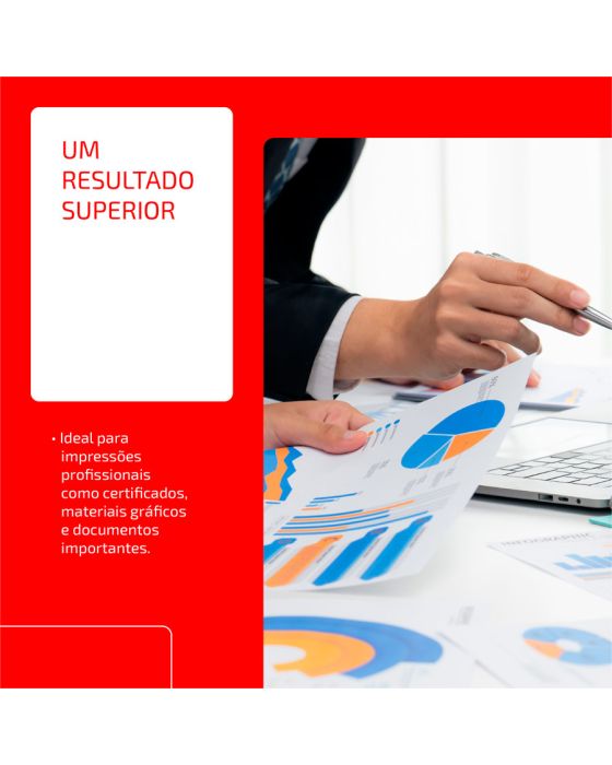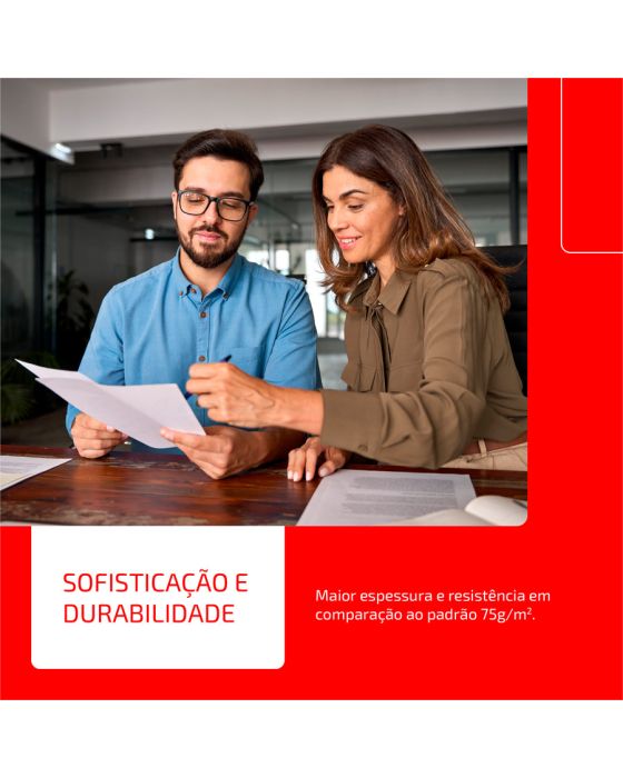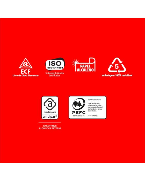 Caracteristicas:- Papel para alta qualidade de apresentação. Sua gramatura de 90g/m² resulta em um papel mais encorpado, garantindo resultado superior. - Tem superfície resistente, corte perfeito e equilibrada absorção, permitindo melhor deslizamento do papel na impressora e evitando desperdício de tinta.- É produzido a partir do cultivo de eucalipto 100% renovável e as fibras são tratadas para obter o mais elevado grau de brancura.- Formato: A4 (210x297mm)- Gramatura: 90g/m2- Folhas/resma:500- Resma/caixa: 5- Certificação: Cerflor * As especificações podem ser alteradas sem aviso prévio ** Imagem meramente ilustrativa.