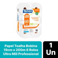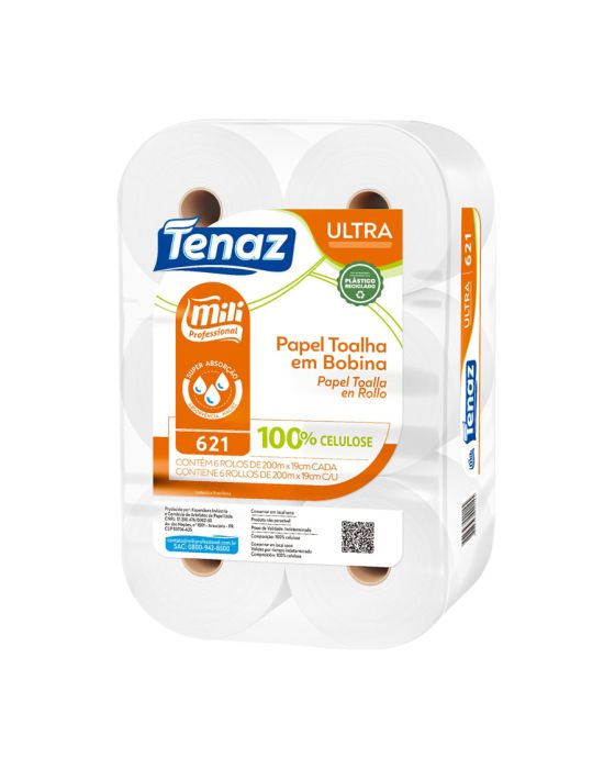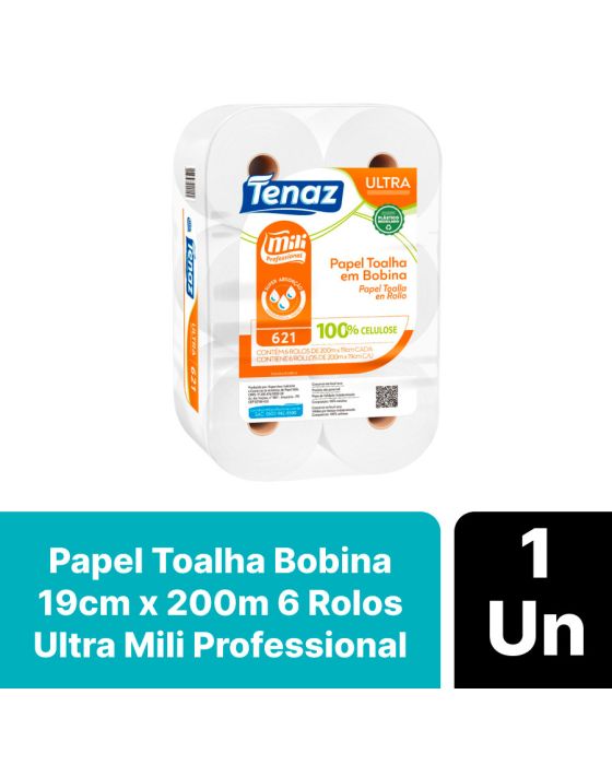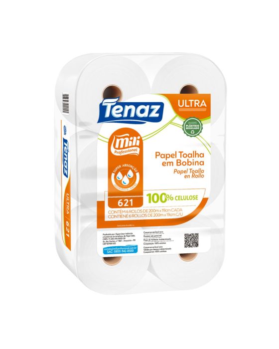 Características:O Papel Toalha Bobina Branco Ultra Tenaz Mili Professional te garante maior absorção e maciez, além de ser fabricado em 100% celulose o que garante maior conforto e qualidade! É ideal para banheiros e lavabos que possuem grande circulação, como banheiros e lavabos corporativos, restaurantes, lanchonetes, supermercados, shoppings e demais ambientes que tenha grande circulação.Detalhes:- Marca: Tenaz;- Fabricante: Mili Professional;- Modelo: Ultra;- Referência: 621;- Linha: Papel Toalha;- Tipo: Bobina;- Cor: Branco;- Quantidade: 6 rolos;- Tamanho: 19m x 200m;- Contém: 1 embalagem com 6 rolos;- Gramatura: Aproximadamente 25 g/m2;- Produto não perecível;- 100% Celulose;- Super Absorção;- Absorvência e Maciez.Indústria Brasileira. | Validade: Indeterminado.Especificações técnicas:- Gramatura (gr/m²): 23 ~ 25 gr/m²;- Alvura (%): Mínimo 80;- Diâmetro: 160 ~ 158cm;- Metragem: 200m.Composição:- Fabricado em 100% celulose.Armazenamento:- Não armazenar em ambientes com umidade e que contenha odores;- Armazenamento na embalagem original.Medidas:- Dimensões da unidade (rolo cada): 19cm x 200m;- Dimensões da embalagem: 46 x 30,5 x 19cm (CxLxA);- Peso embalagem: 5,472kg;- Peso bobina (cada): 412g.* As especificações podem ser alteradas sem aviso prévio** Imagem meramente ilustrativa.