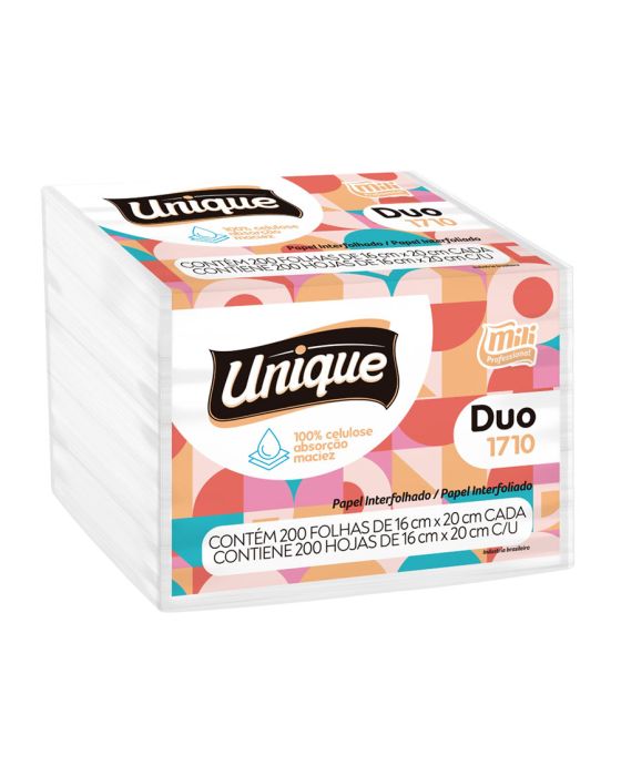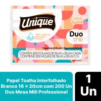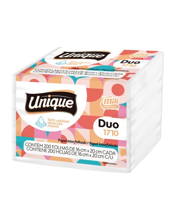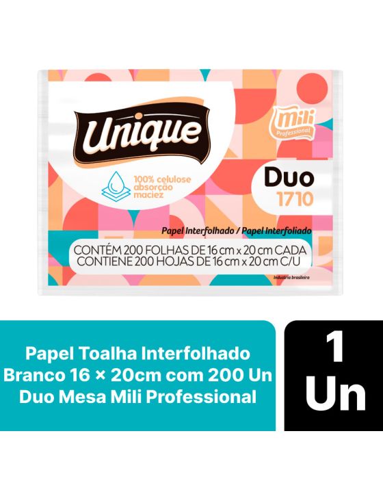 Características:O Papel Toalha Interfolhado Branco Duo Mili Professional te garante maior absorção e maciez, além de ser fabricado em 100% celulose o que garante maior conforto e qualidade! Para permitir que você leve e deixe em uma mesa ou até mesmo na bolsa, possui picote para que quando você precisar basta puxar e sairá uma folha de papel toalha.Detalhes:- Marca: Unique;- Fabricante: Mili Professional;- Modelo: Duo;- Referência: 1710;- Linha: Papel Toalha;- Tipo: Interfolhado;- Cor: Branco;- Quantidade: 200 folhas;- Tamanho: 16m x 20cm;- Contém: 1 embalagem com 200 folhas;- Gramatura: Aproximadamente 15,5 g/m2;- Produto não perecível;- Ideal para mesa;- 100% Celulose;- Super Absorção;- Absorvência e Maciez.Indústria Brasileira. | Validade: Indeterminado.Especificações técnicas:- Gramatura (gr/m²): 13,5 ~ 15,5 gr/m²;- Alvura (%): Mínimo 80.Composição:- Fabricado em 100% celulose.Armazenamento:- Não armazenar em ambientes com umidade e que contenha odores;- Armazenamento na embalagem original.Medidas:- Dimensões da unidade (folha): 16cm x 20cm;- Dimensões da embalagem: 16 x 10,5 x 12cm (CxLxA);- Peso: 185,6g.* As especificações podem ser alteradas sem aviso prévio** Imagem meramente ilustrativa.