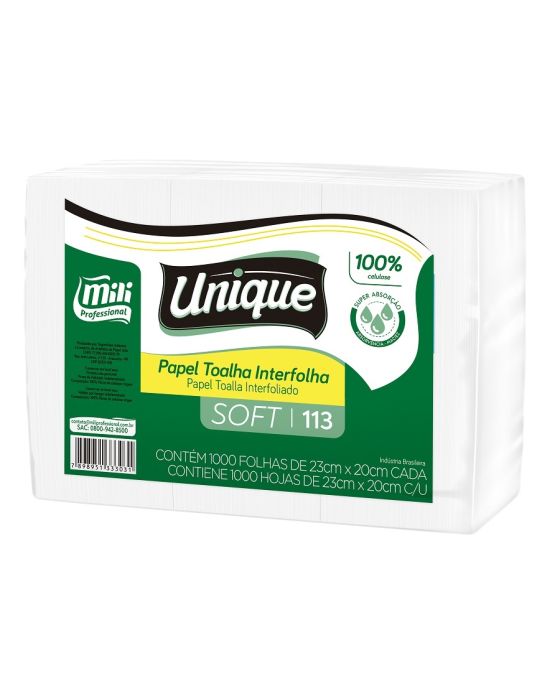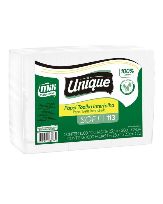 Características:Papel toalha interfolhado Mili Unique 2 dobras e 100% celulose. Pacote com 1.000 folhas de 23 cm x 20 cm. - Linha: Mili Interfolha Soft - Medidas: 20x23cm - Referência 113 - 100% celulose Virgem - Gramatura: 20gr/m2 - Uso: Para toalheiros interfolha de 2 ou 3 dobras - Observações: Fardo com 1.000 folhas(3 pcts c/ 334 folhas) - Marca: Mili Professional * Imagens meramente ilustrativas