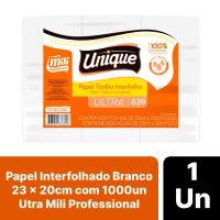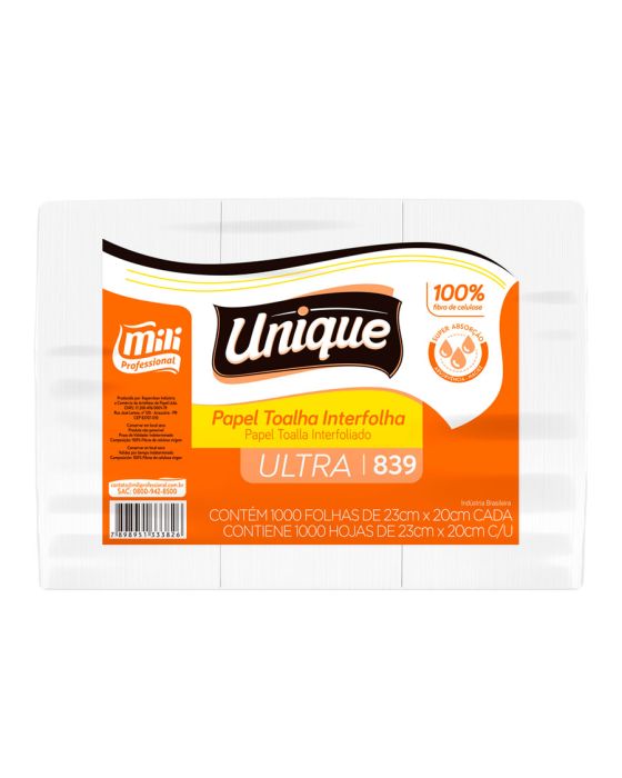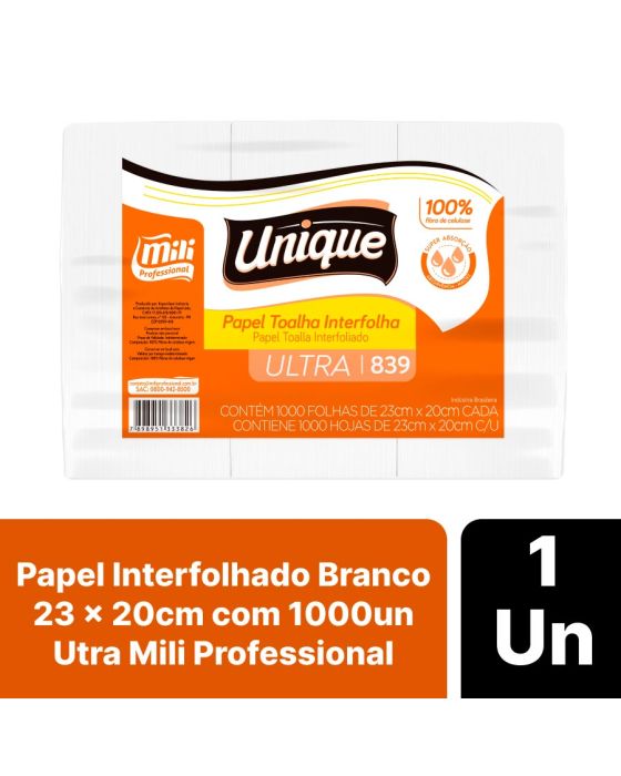 Características:Maior Absorção e Maciez ao enxugar as mãos? o Papel Toalha Interfolhado Branco Ultra Mili Professional irá te entregar isso! Ideal para banheiros, lavabos e vestiários, garanta um maior conforto na hora de secar as mãos, além disso é fabricado com 100% Celulose, para garantir um produto de qualidade!Detalhes:- Marca: Unique;- Fabricante: Mili Professional;- Modelo: Utra;- Referência: 839;- Linha: Papel Toalha;- Tipo: Interfolhado;- Cor: Branco;- Quantidade: 1.000 folhas;- Tamanho: 23m x 20cm;- Contém: 1 embalagem com 1.000 folhas;- Gramatura: Aproximadamente 20 g/m2;- Produto não perecível;- 100% Celulose;- Super Absorção;- Absorvência e Maciez.Indústria Brasileira. | Validade: Indeterminado.Especificações técnicas:- Gramatura (gr/m²): 23,5 ~ 24,5 gr/m²;- Umidade: Máximo 10%;- Alvura (%): Mínimo 80.Composição:- Fabricado em 100% celulose.Armazenamento:- Não armazenar em ambientes com umidade e que contenha odores;- Armazenamento na embalagem original.Medidas:- Dimensões da unidade (folha): 23m x 20cm;- Dimensões da embalagem: 36 x 22,5 x 20cm (CxLxA);- Peso: 5,520kg.* As especificações podem ser alteradas sem aviso prévio** Imagem meramente ilustrativa.