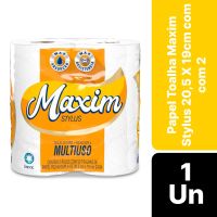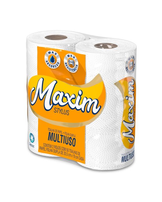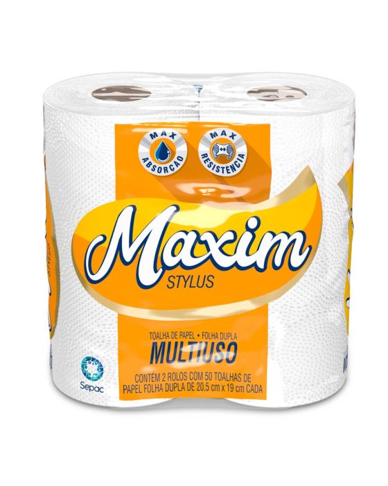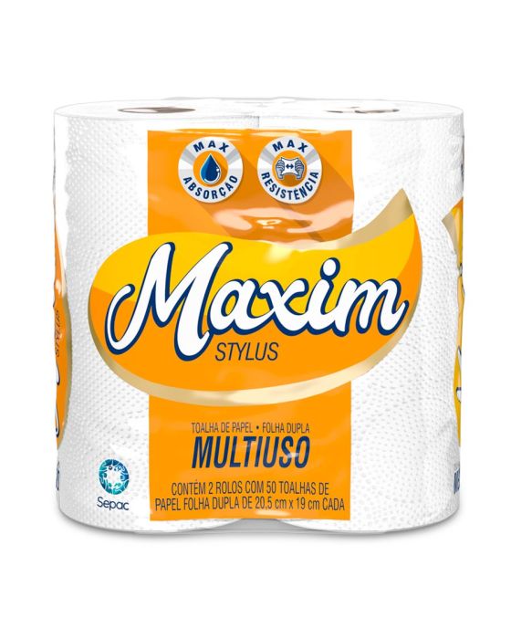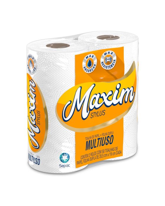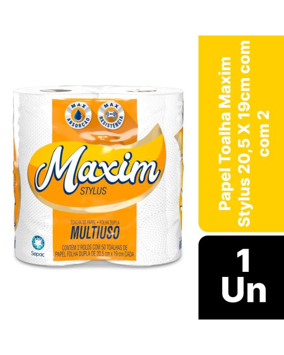 Características:A toalha de papel Maxim Stylus oferece mais comodidade e praticidade para a sua rotina. Como um papel multiuso, o Stylus é garantia de qualidade com um controle bacteriológico atestado internacionalmente. Suas folhas apresentam como principais características a alta absorção e a alta resistência, aliadas a um ótimo custo-benefício.Detalhes:- Marca: Maxim;- Fabricante: Sepac;- Modelo: Stylus;- Linha: Papeis toalha;- Tipo: Rolo;- Folhas: Dupla;- Cor: Branco;- Tamanho: 20,5 x 19cm cada folha;- Quantidade de folhas: 200 folhas;- Quantidade de rolos: 2 rolos- Contém: 1 rolo com 2 rolos do produto;- Segurança para o manuseio de alimentos;- Máxima Absorção e resistência;- Folha dupla picotada e gofrada.Indústria Brasileira. | Validade: Indeterminada.Ideal para:- Ideal para limpar de ferramentas, higienização de utensílios, estética veicular, secar comidas gordurosas como batatas fritas e empanados e cuidado para as unhas e maquiagens.Composição:- Fabricado com 100% fibras celulósicas.Medidas:- Dimensões da toalha (cada): 20,5 x 19cm;- Dimensões do rolo: 8,5 x 8,5 x 20cm (CxLxA);- Dimensões da embalagem: 19 x 9,5 x 20cm (CxLxA);- Peso: 231g.* Possui controle biológico: Método que permite remoção, redução e inibição do crescimento de microrganismos patógenos ou que causam deterioração do produto.* As especificações podem ser alteradas sem aviso prévio ** Imagem meramente ilustrativa.
