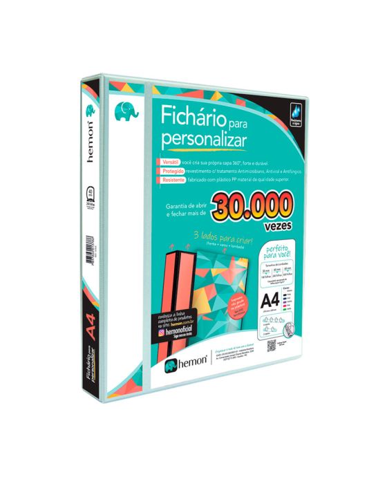 Características:O fichário Chies possui alta resistência e durabilidade sendo perfeito para organizar seu escritorio ou até mesmo utilizar como fichário escolar, tabela de preços, catálogo, arquivamento e outros.A maneira mais rápida e economica de personalizar sua pasta!Detalhes: - Marca: Hemon;- Referência: 1378;- Linha: Fichário Argolado;- Cor: Branco;- Tamanho: A4;- Ferragens: 25D - 4 Argolas;- Lombada: 40mm;- Contém: 1 unidade do produto;- Capacidade: Aproximadamente 70 refis de plástico PP ou 240 folhas de papel 75g/m2;- Personalização em 4 partes com visor transparente Anti-Reflexo, o impresso não gruda no plástico; - Com bolso interno com porta cartões;- Produto de fácil limpeza, com ferragem, prático para manuseio e reposição de refis.Ideal para:- fichário escolar, tabela de preços, pasta catálogo, arquivamento e outros.Composição:- Capa: Capa dura em polipropileno;- Material resistente e sofisticado;- Não contém PVC.Medidas:- Dimensões do produto: 27 x 32 x 4cm.* As especificações podem ser alteradas sem aviso prévio ** Imagem meramente ilustrativa