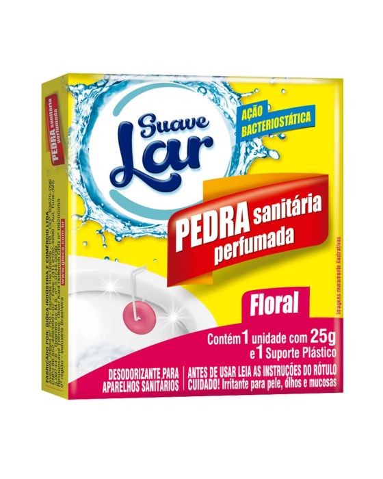 Caracteristicas:A Pedra Sanitária Suave Lar (desodorizante sanitário) possui ação bacteriostática, higieniza e perfuma todo o vaso sanitário a cada fluxo de descarga, deixando um agradável perfume de limpeza em seu banheiro.Detalhes:- Marca: Suave Lar.- Fabricante: Gióca.- Linha: Pedra Sanitária.- Fragrância: Floral.- Peso: 25g.- Contém: 1 unidade de 25g e 1 suporte plástico.Modo de usar:- Aplicação: Abra o saco plástico e retire o refil. Em seguida, introduza o gancho no orifício central do produto. Coloque o conjunto na borda interna do vaso sanitário.- Ação: A pedra sanitária é constituída por uma mistura de essência, corante, paradiclorobenzeno e o ativo bacteriostático. O paradiclorobenzeno, que tem a propriedade de sofrer sublimação, permite separá-lo das demais substâncias. - A cada descarga o produto recebe um fluxo de água que arrasta o ativo produzindo uma solução que age e permanece no vaso, desodorizando e perfumando por muito mais tempo.Composição: - Paradiclorobenzeno, ativo bacteriostático, corante e essência. Teor de ativo: 0.4% de cloreto de benzalcônio.Armazenamento:- Conservar em temperatura ambiente, em local seco e fresco.ATENÇÃO! CONSERVE FORA DO ALCANCE DAS CRIANÇAS E ANIMAIS DOMÉSTICOS.* As especificações podem ser alteradas sem aviso prévio ** Imagem meramente ilustrativa