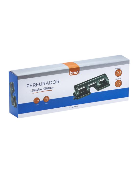 Características:O Perfurador de Metal 4 Furos Base de 27cm BRW é um produto indispensável para garantir o máximo de praticidade em seu dia a dia! Produzido a partir de matéria-prima de qualidade, possui estrutura metálica resistente e capacidade para perfurar até 20 folhas de 75g/m². Além disso, conta com base plástica antideslizante de 27cm. Seu uso é prático, confortável e exige pouco esforço manual. Detalhes:- Marca: BRW;- Referência: PF1004;- Linha: Perfuradores;- Cor: Preto;- Quantidade de furos: 4 furos;- Contém: 1 unidade do produto;- Capacidade de folhas: 20 folhas;- Gramatura das folhas: Até 75 g/m2;- Base de borracha e corpo de metal;- Base de 27cm.Fabricado na China. | Validade: Indeterminada.Ideal para:- É ideal para escritórios, cartórios, papelarias, salas de aula e até mesmo para uso doméstico e perfeito para auxiliar na criação de itens personalizados, tal como scrapbooks.Geral:- Distâncias entre os furos: 8cm entre os furos;- Alcance: 1,2cm de alcance;- Diâmetro dos furos: 0,6cm de diâmetro de cada furo.Composição:- Fabricado em Resina termoplásticas e metal.Medidas:- Dimensões do produto: 26,6 x 8,2 x 5,4cm (CxLxA);- Dimensões da embalagem: 27,6 x 5,4 x 9,1cm (CxLxA);- Peso: 835g.* As especificações podem ser alteradas sem aviso prévio ** Imagem meramente ilustrativa.