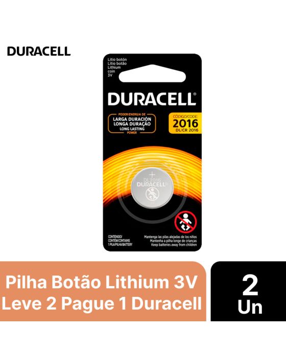 Características:As pilhas Duracell® tipo moeda oferecem a qualidade que só a Duracell® pode oferecer, e possuem energia de longa duração e diversos recursos de segurança para as crianças e bebês, sendo ideal para todo item eletrônico desde brinquedos até relógios!Detalhes:- Marca: Duracell;- Modelo: CR2016;- Referência: 5003999;- Linha: Pilhas;- Tipo: Moeda;- Volts: 3V;- Cor: Prata;- Contém: 2 Unidades do produto;- Embalagem promocional: Leve 2 Pague 1;- A bateria Duracell possui potência confiável e prolongada;- Melhor performance VS pilha de zinco, dura muito mais;- Design aperfeiçoado e melhor desempenho.Ideais para:- São adequadas para chaveiros, controles remotos pequenos, balanças, wearables, sensores, dispositivos médicos (medidores de glicose, termômetros digitais) e dispositivos esportivos (monitor de frequência cardíaca, acessórios para bicicletas).Importante:- Embalagem com trava de segurança: Dupla proteção que só pode ser aberta por adultos utilizando uma tesoura;- Nova tecnologia de segurança para crianças: Uma camada que não é tóxica, mas tem um sabor amargo com Bitrex®, a substância mais amarga do mundo, é aplicada na parte posterior da pilha para evitar que bebês e crianças as engulam.Medidas:- Diâmetro do produto: 2cm;- Altura do produto: 0,16cm.ATENÇÃO! MANTENHA FORA DO ALCALCE DAS CRIANÇAS MENORES DE 3 (TRÊS) ANOS POR CONTER PARTE(S) PEQUENA(S) QUE PODE(M) SER ENGOLIDA(S) OU ASPIRADA(S).* As especificações podem ser alteradas sem aviso prévio ** Imagem meramente ilustrativa.